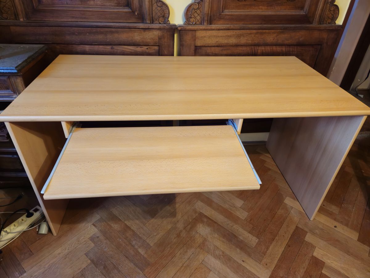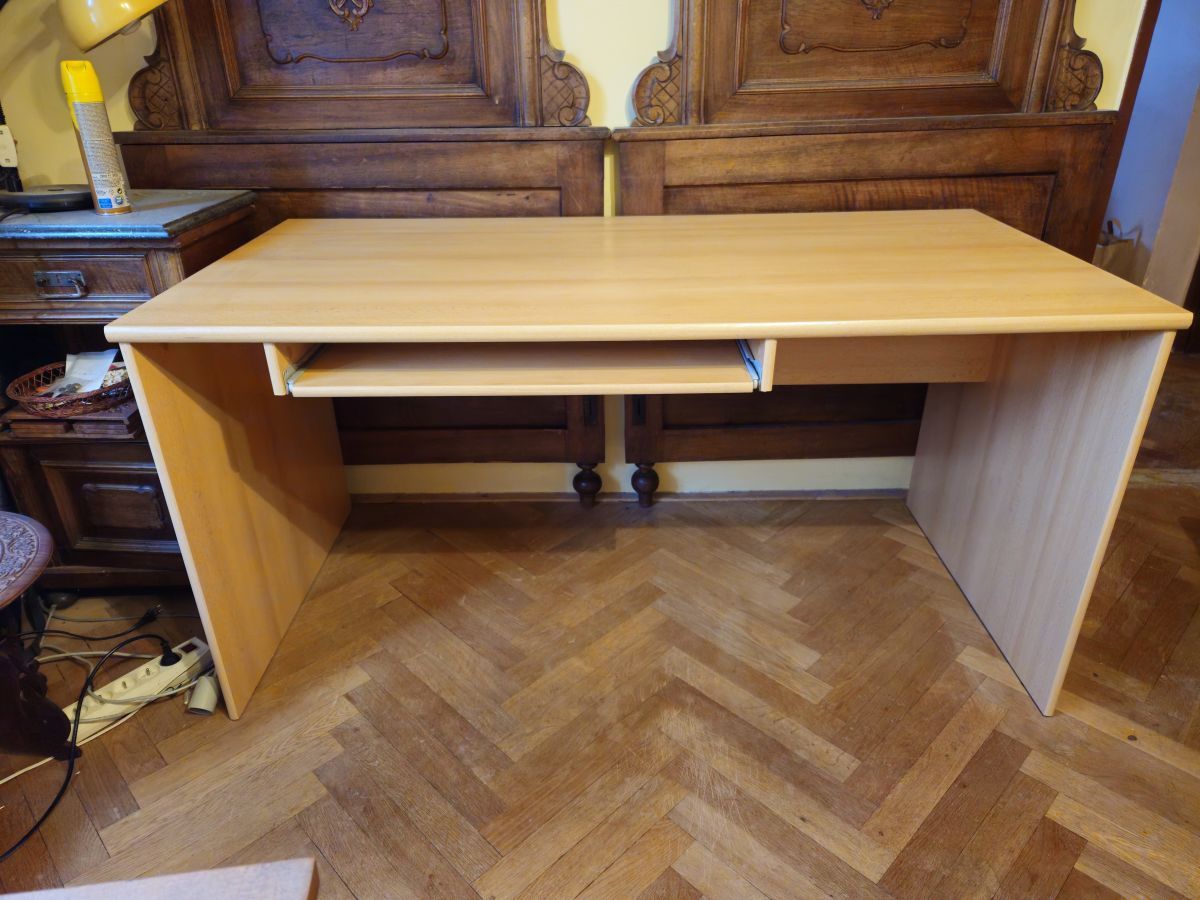 Velký psací / PC stůl s výsuvnou deskou pro klávesnici. Velmi hezký stav kromě několika drobných až úplně zblízka viditelných odřeninek viz foto.