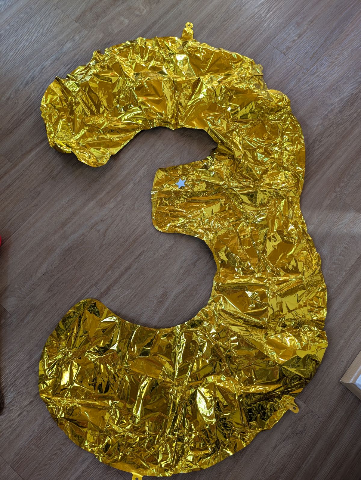 Daruji za odvoz nepoužitý foliový balonek na oslavu narozenin s číslicí 3. Má zlatou barvu, uprostřed je ozdoben modrou hvězdičkou. Rozměry 140 x 80 cm.