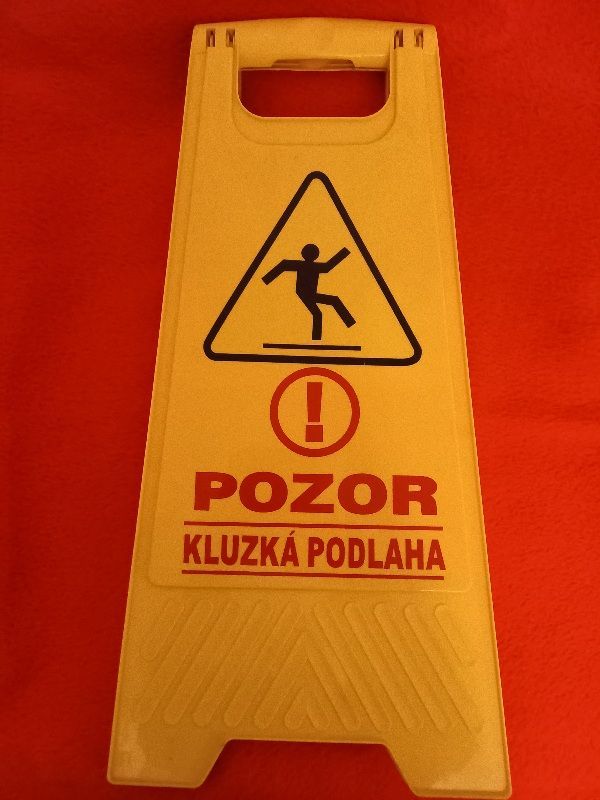 Daruji za odvoz rozkládací výstražnou ceduli Pozor kluzká podlaha. Výška cca 63 cm.