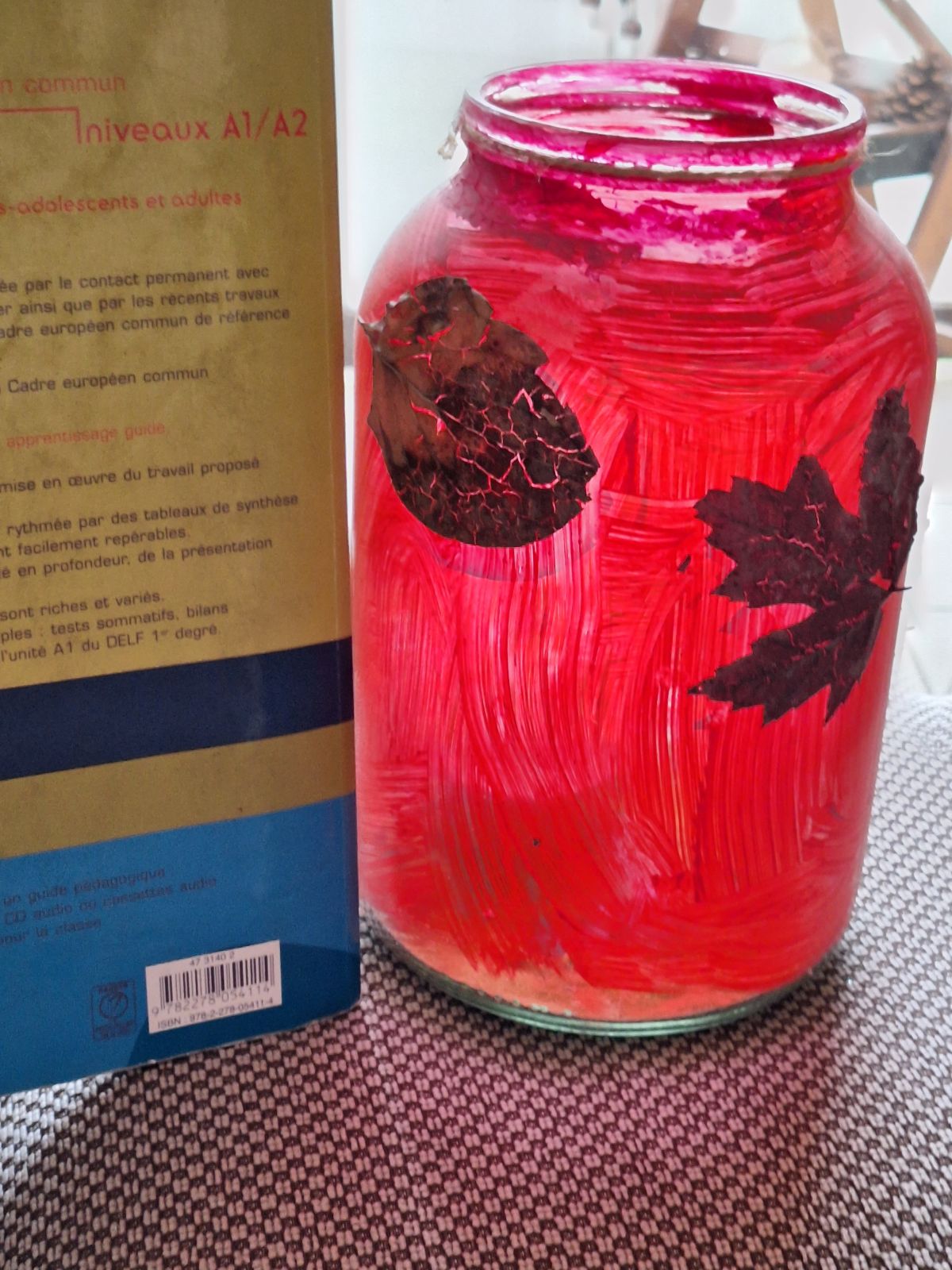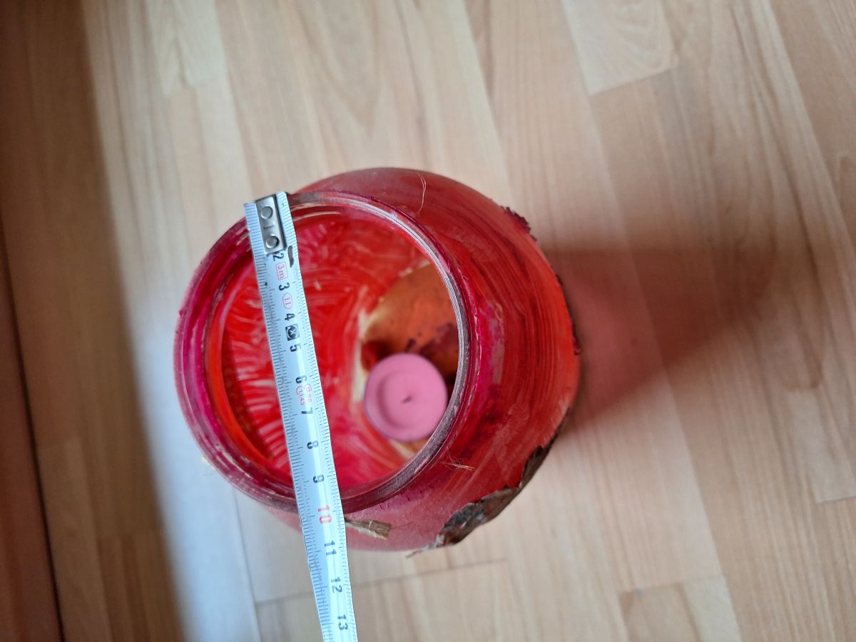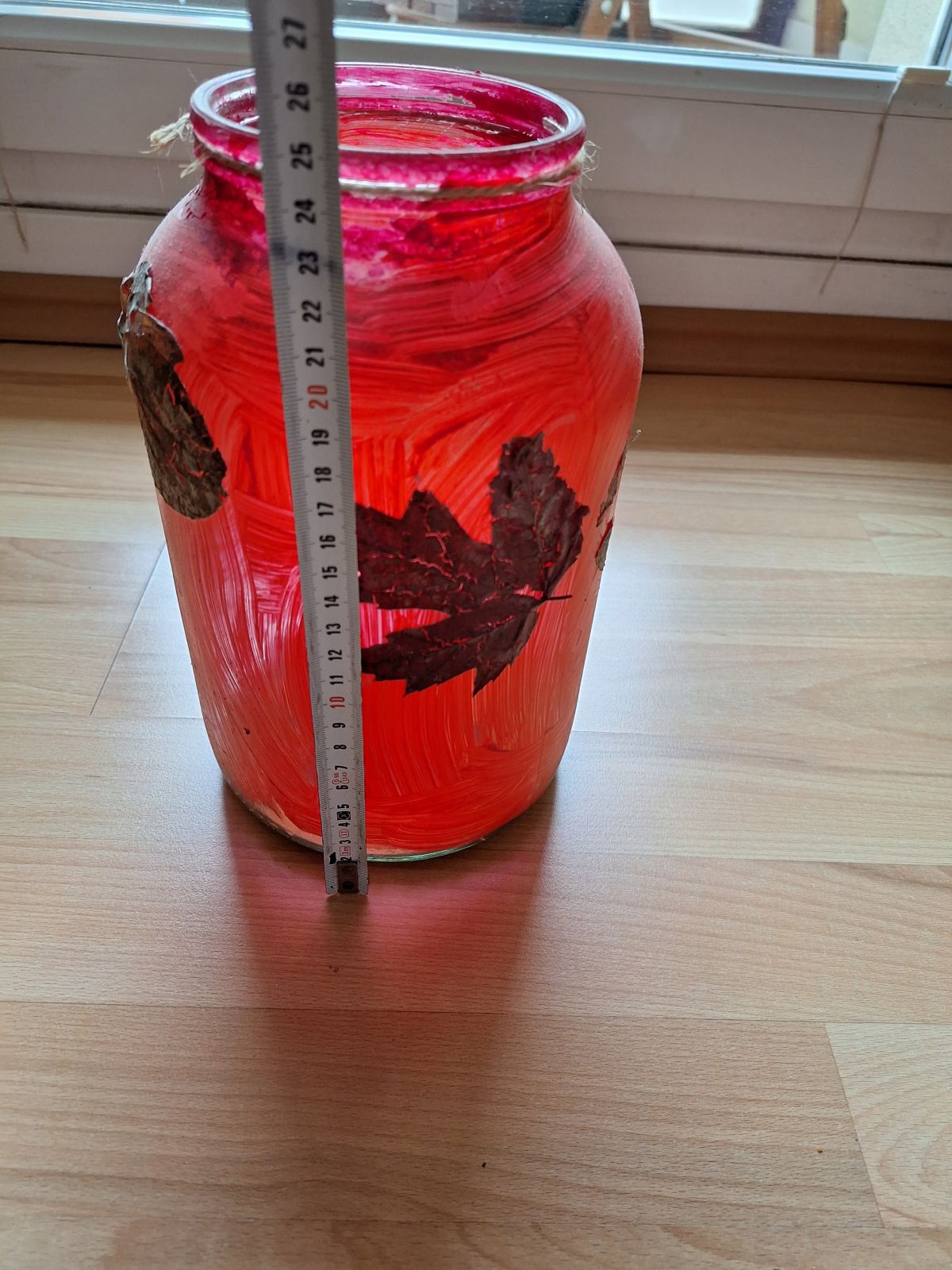 Nevim presne kolik litrova sklenice, ale na foto porovnani s A4 casopisem min.na vysku. Zvenku nabarveno na cerveno, deti delali dekoraci. Nevim zda se da barva odstranit. Mel by nekdo zajem?