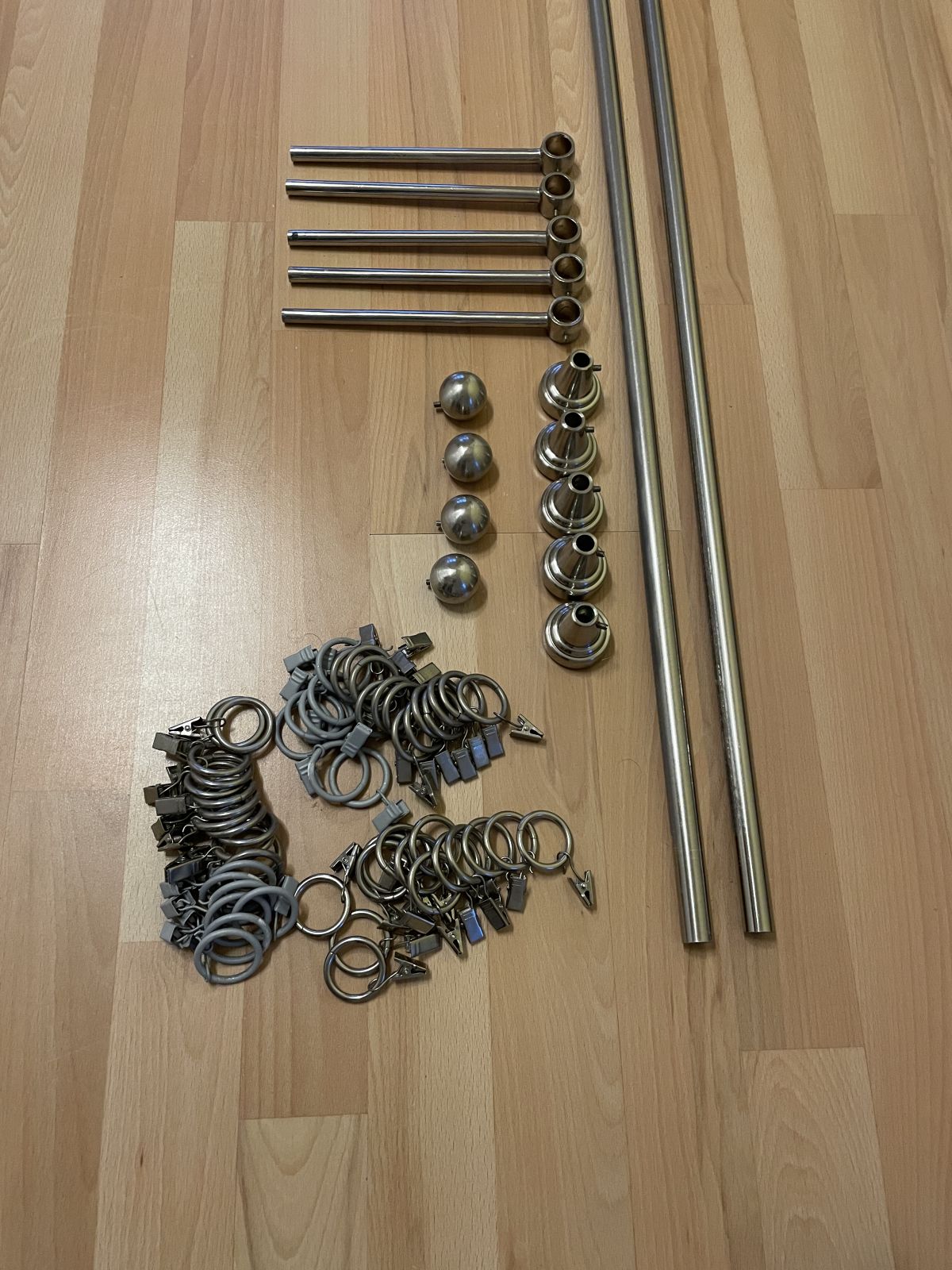Daruji za odvoz dvě jednotyčové kovové garniže délky 160 a 250 cm s celkem pěti držáky.