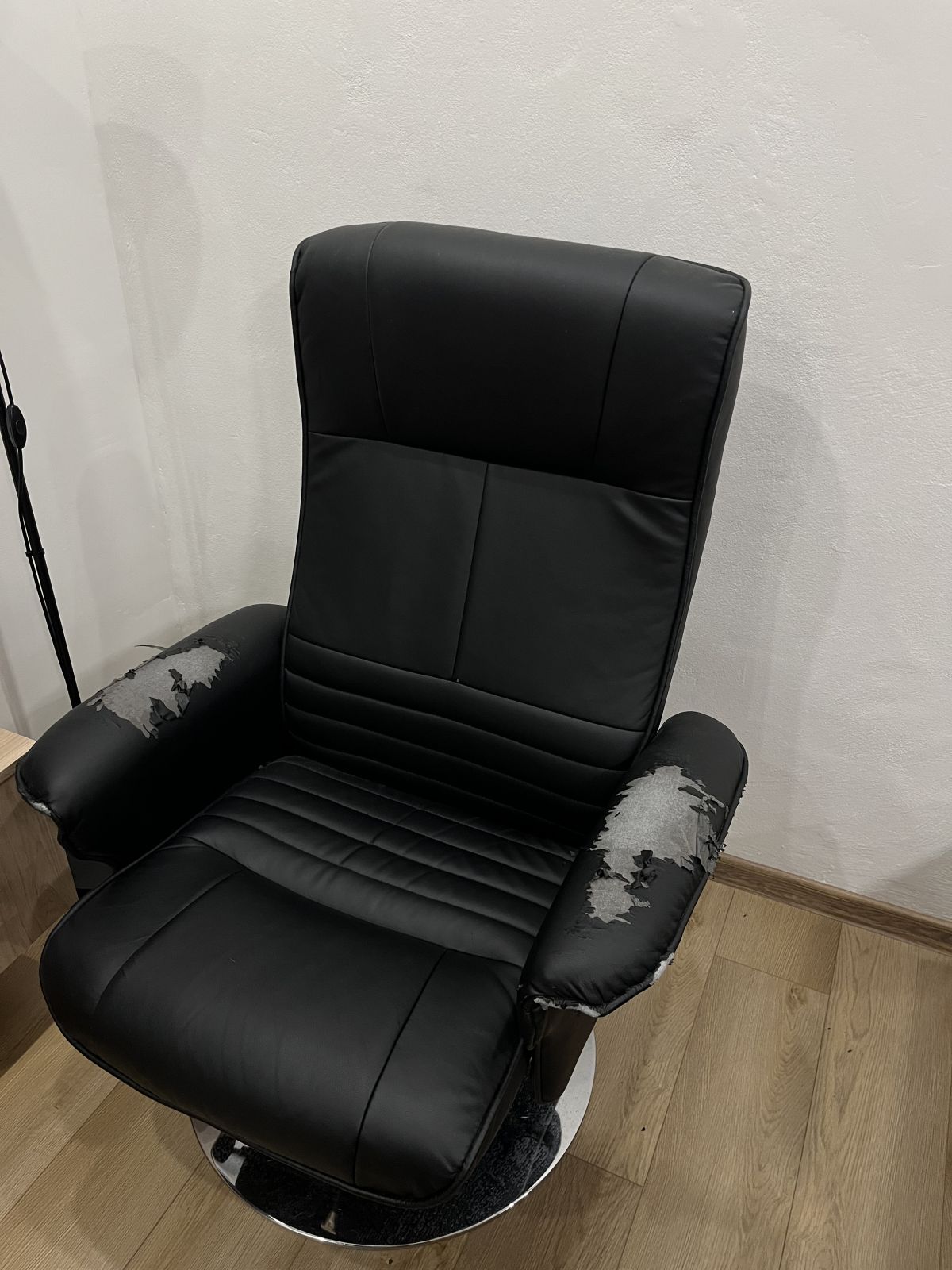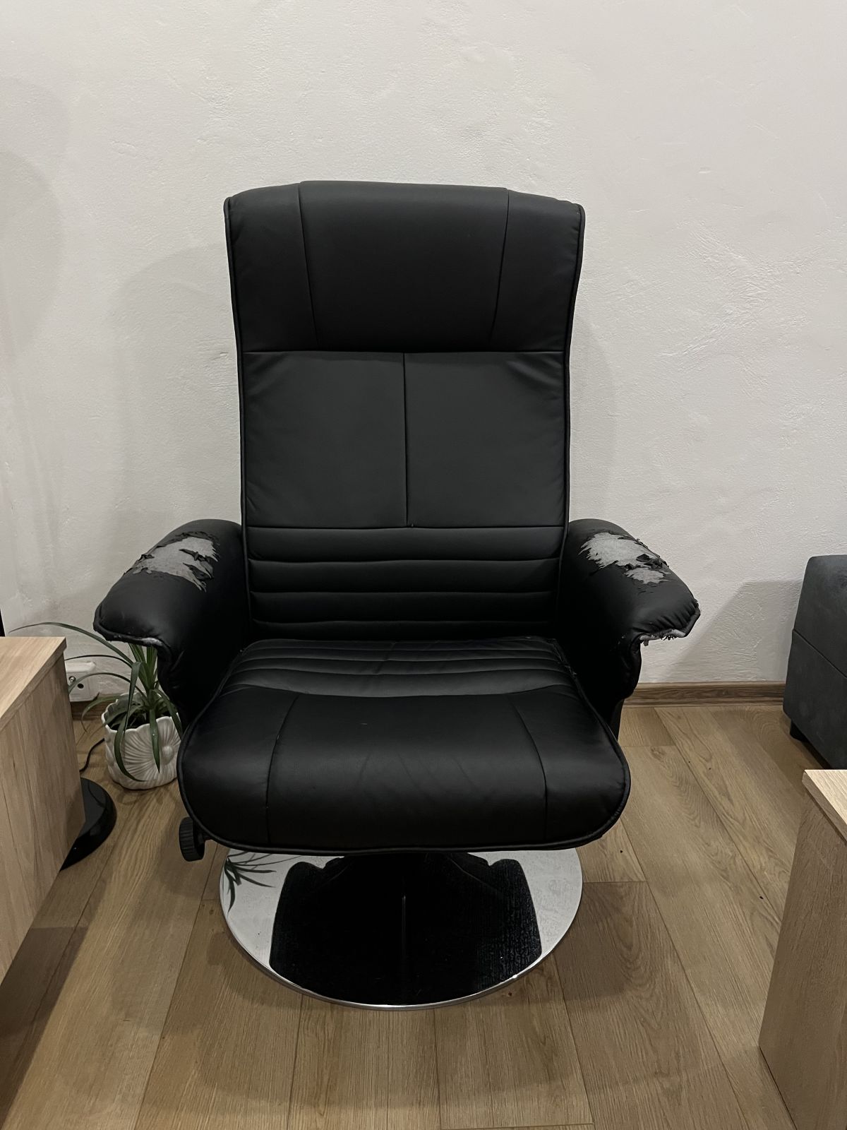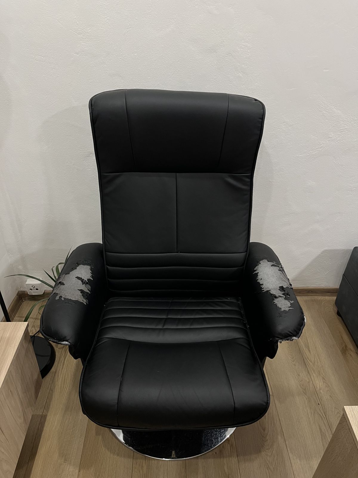 Daruji za odvoz černé kožené křeslo. Křeslo má polohovací opěrku, má však potrhané područky.