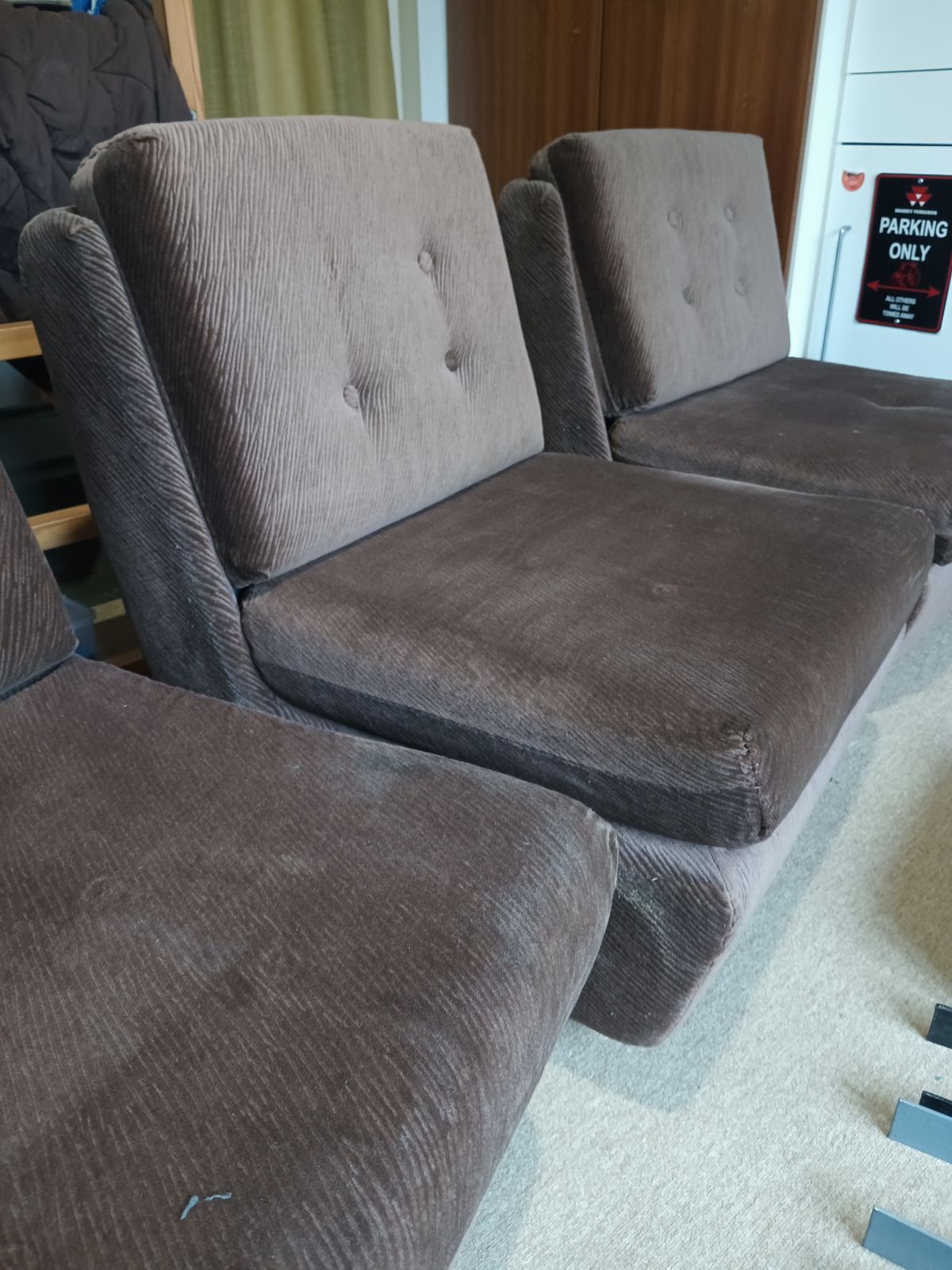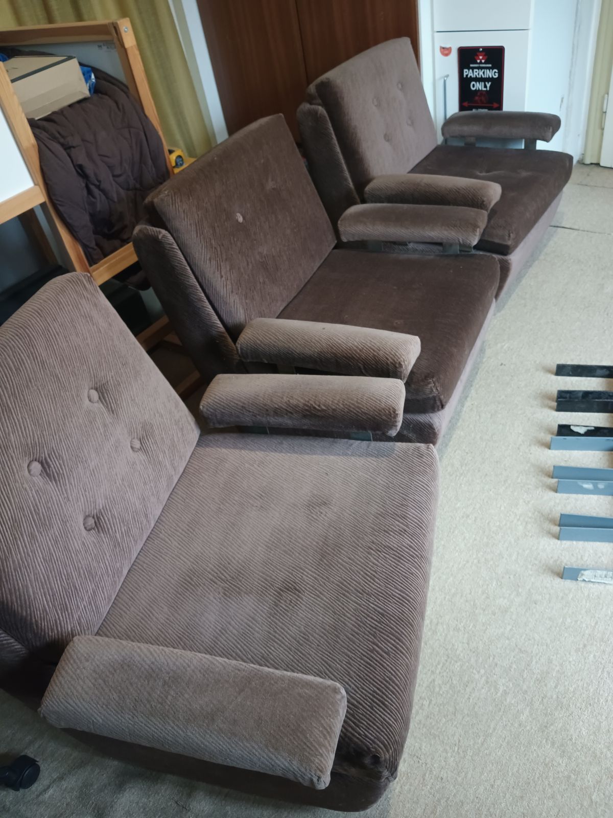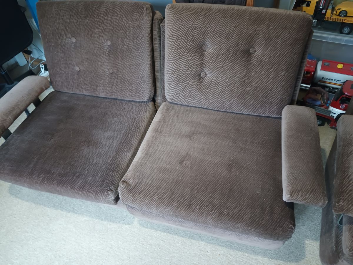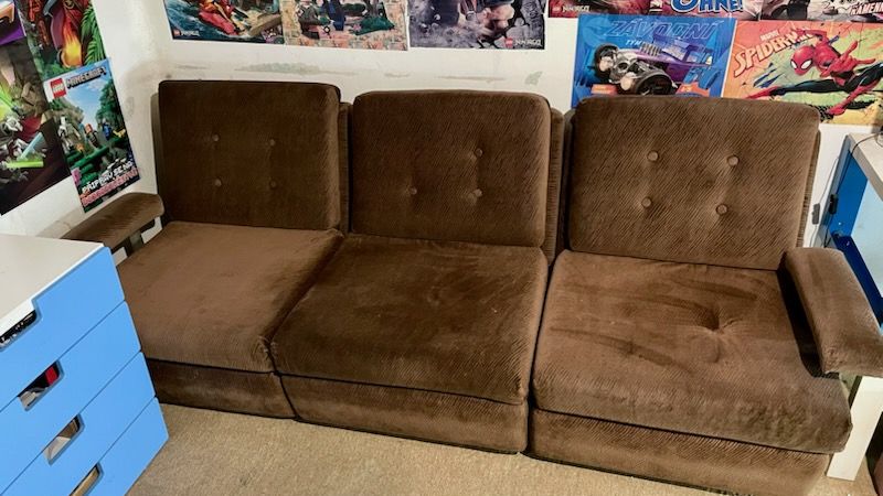 Daruji za odvoz starší sedačku, nově potažená před pár lety, tři moduly které se dají jednoduše spojit a rozpojit, takže podle potřeby vznikne trojsedačka, dvojsedačka+křeslo nebo tři křesla. Opěrky na ruce jsou také vyndavací. Zespodu kolečka, moduly jsou velmi lehké! polštáře na sedáky a opěráky jsou volně vložené do modulů. Potah hnědý sametový manžestr - foceno za denního světla a za umělého osvětlení. Sedačka je čistá, nekuřácká, bez zvířat. Měli jsme ji odloženou v dětském pokoji.