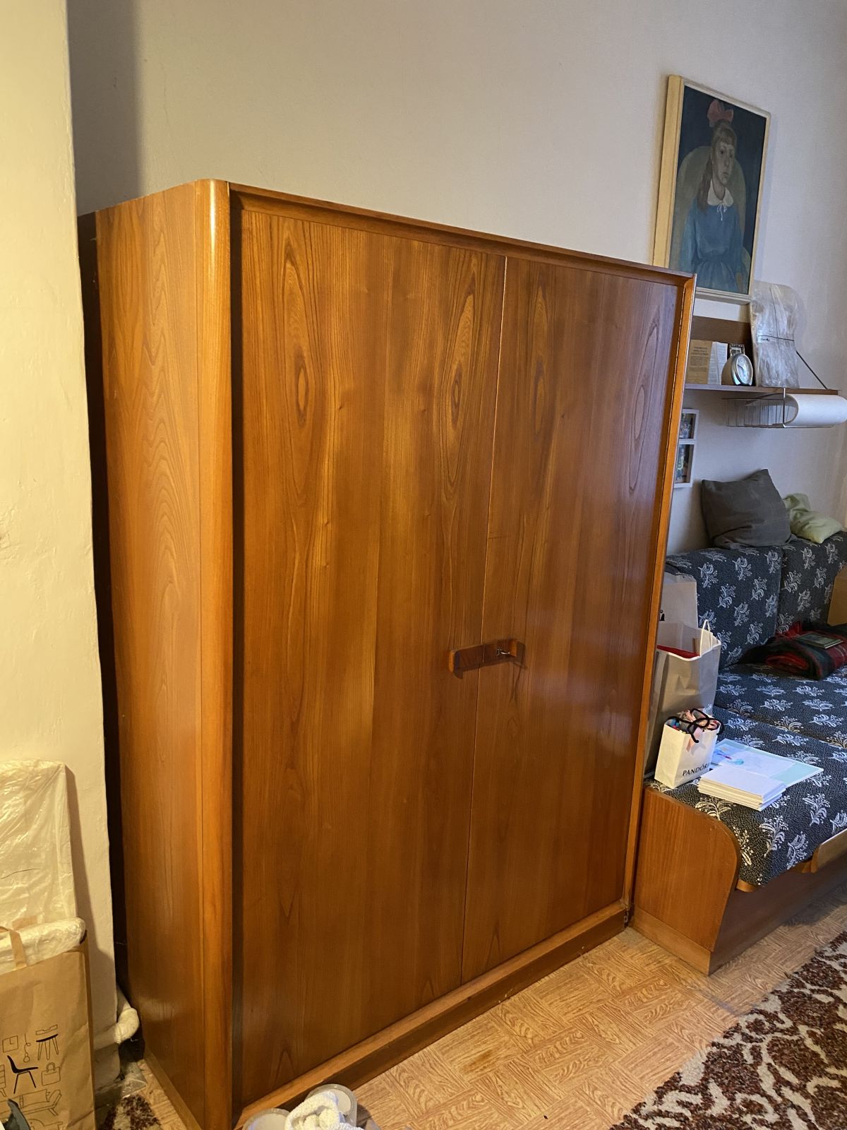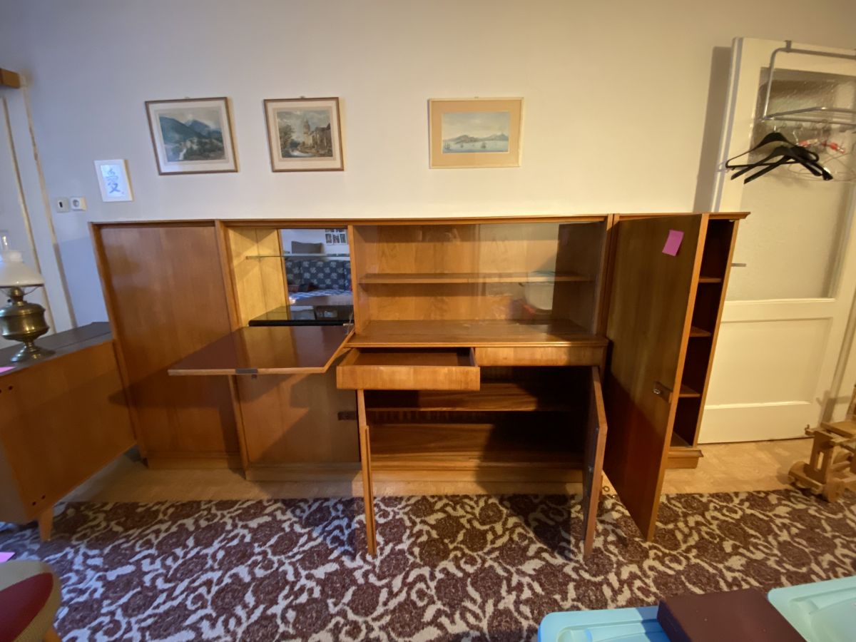 Daruji za odvoz retro nábytkovou sestavu. Set obsahuje šatní skříň, skříňky, knihovnu s úložným prostorem a geniální kousek — vyklápěcí plochu, kterou lze použít jako provizorní stůl.