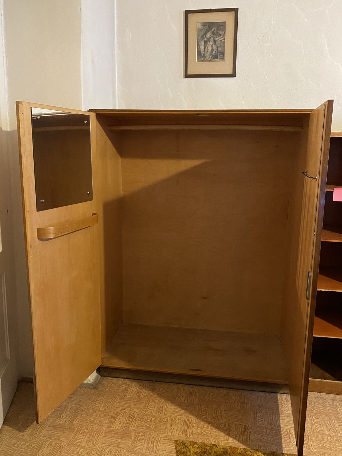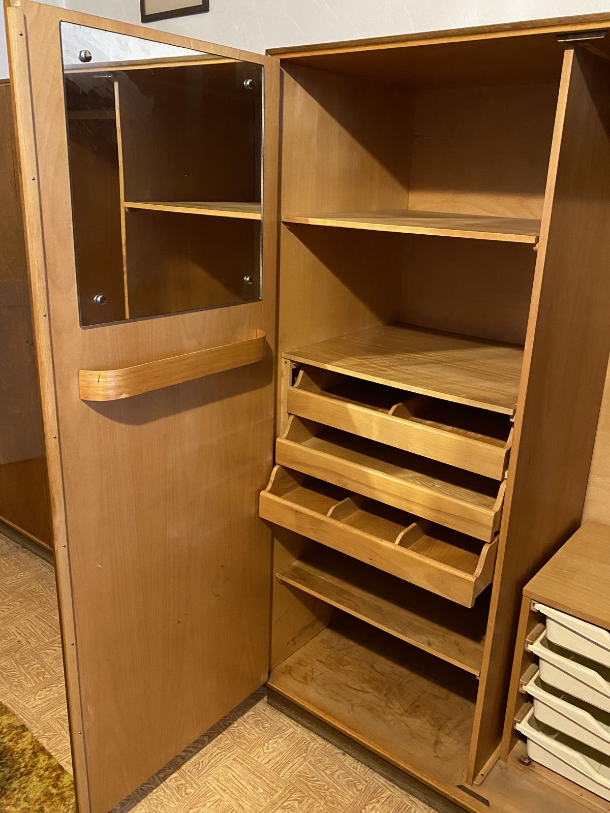 Dvě elegantní skříně v super zachovalém stavu, s vnitřním uspořádáním tak praktickým, že budete mít pocit, že vám někdo potají uspořádal život. Hodí se do bytu, domu, chaty, ateliéru… nebo kamkoli, kde chcete mít stylový úložný prostor.