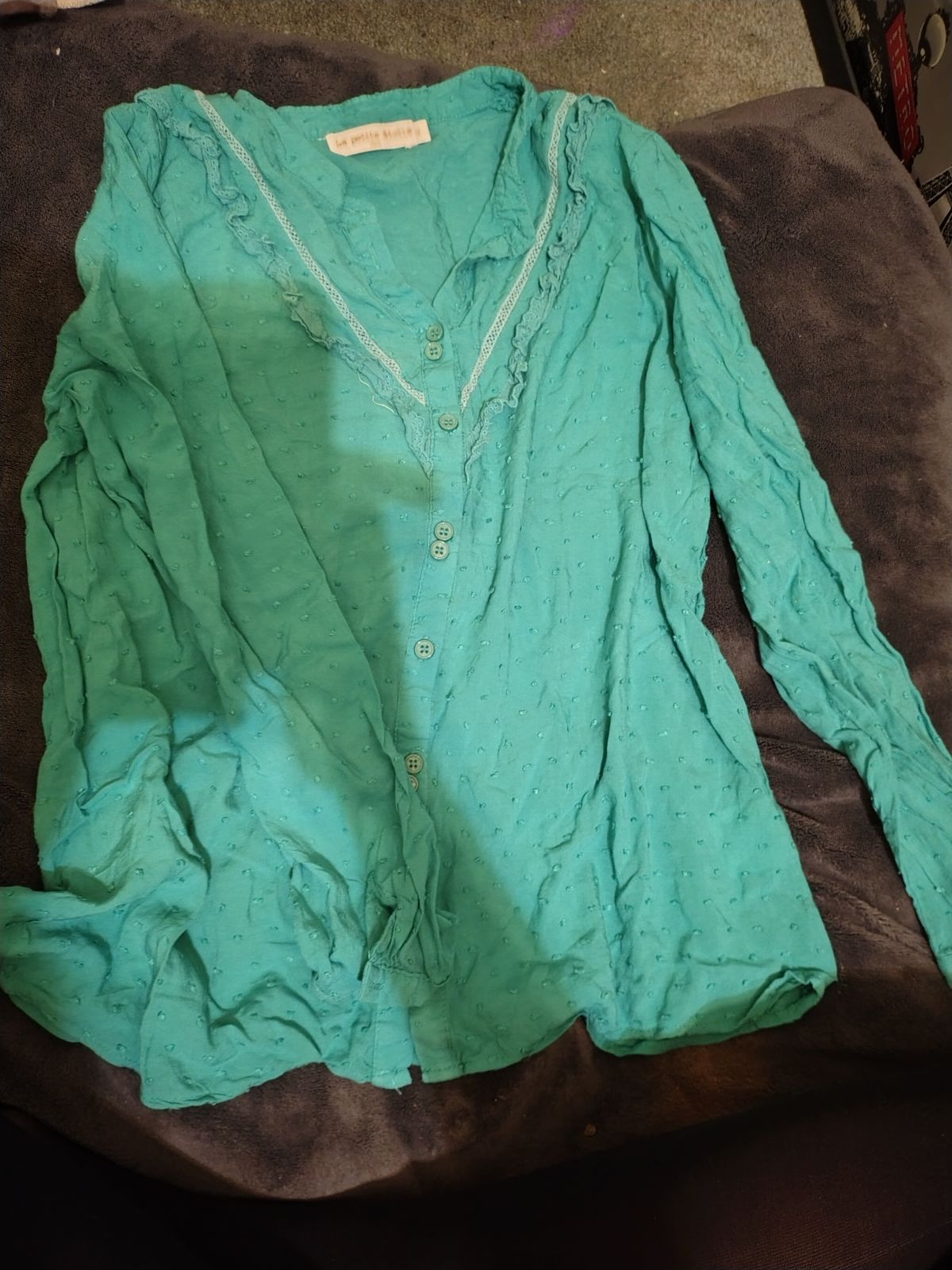 Tyrkysova damska kosile vel.3. Tak 38/40. Prijemny tenky material. Predani pres den Vaclavske namesti, vecer Svandovo divadlo.