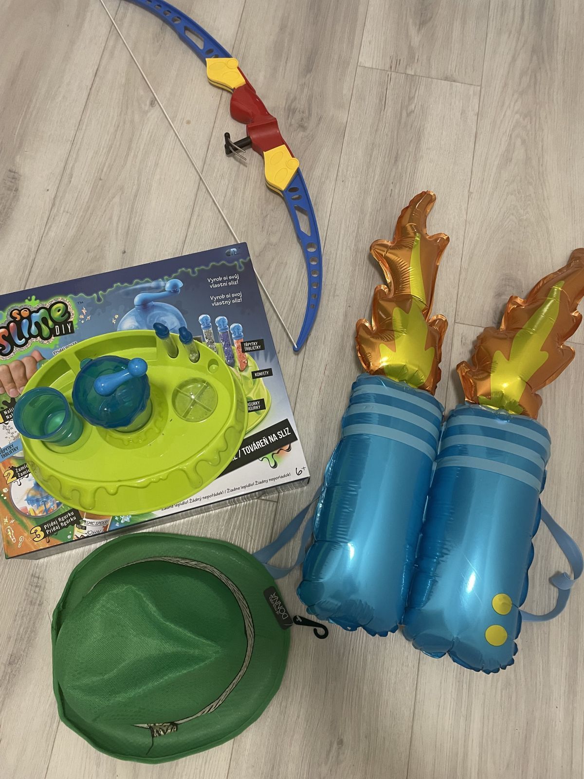 Daruji za odvoz různé hračky. Neúplná laboratoř, nafukovací hračka, luk (šípy se ztratily), klobouček.