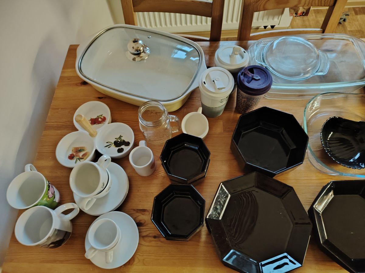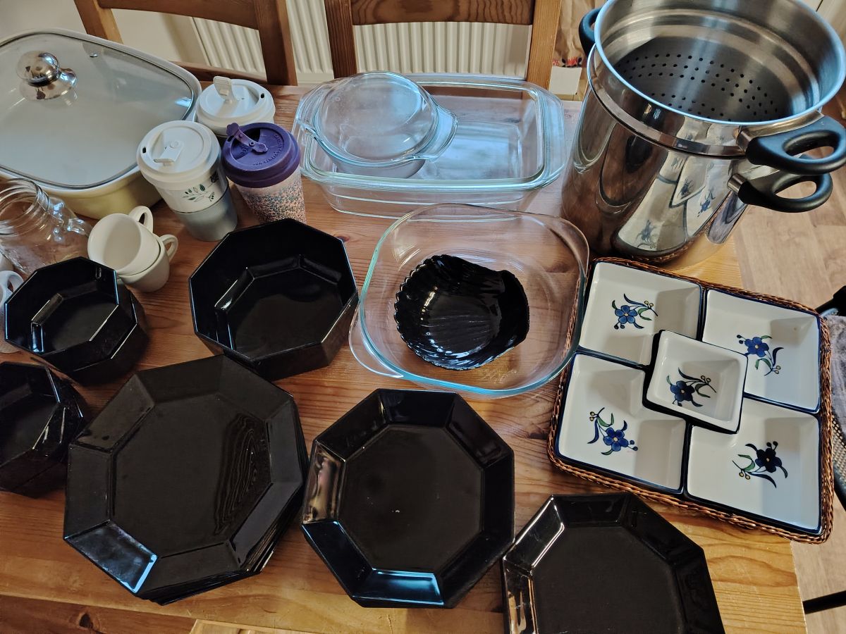 Daruji nádobí. Velká zapékací mísa je prasklá, ale stále pevná. Hrnec na těstoviny nemá poklici. Černá sada nádobí není už po šesti.