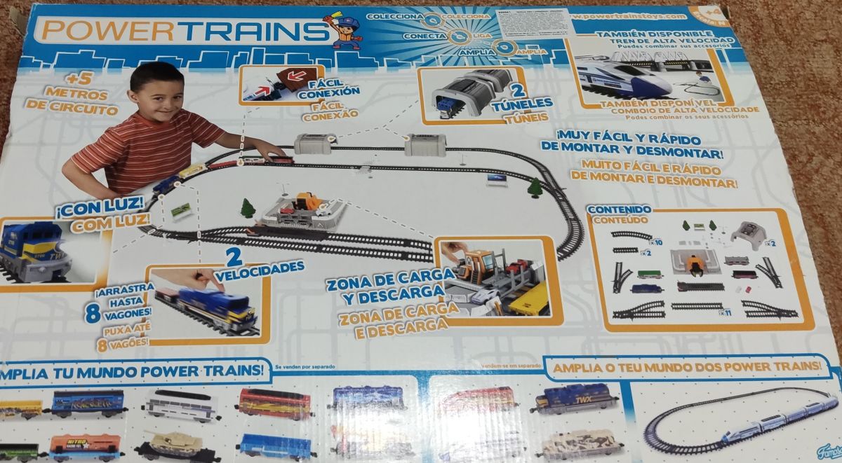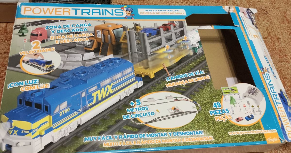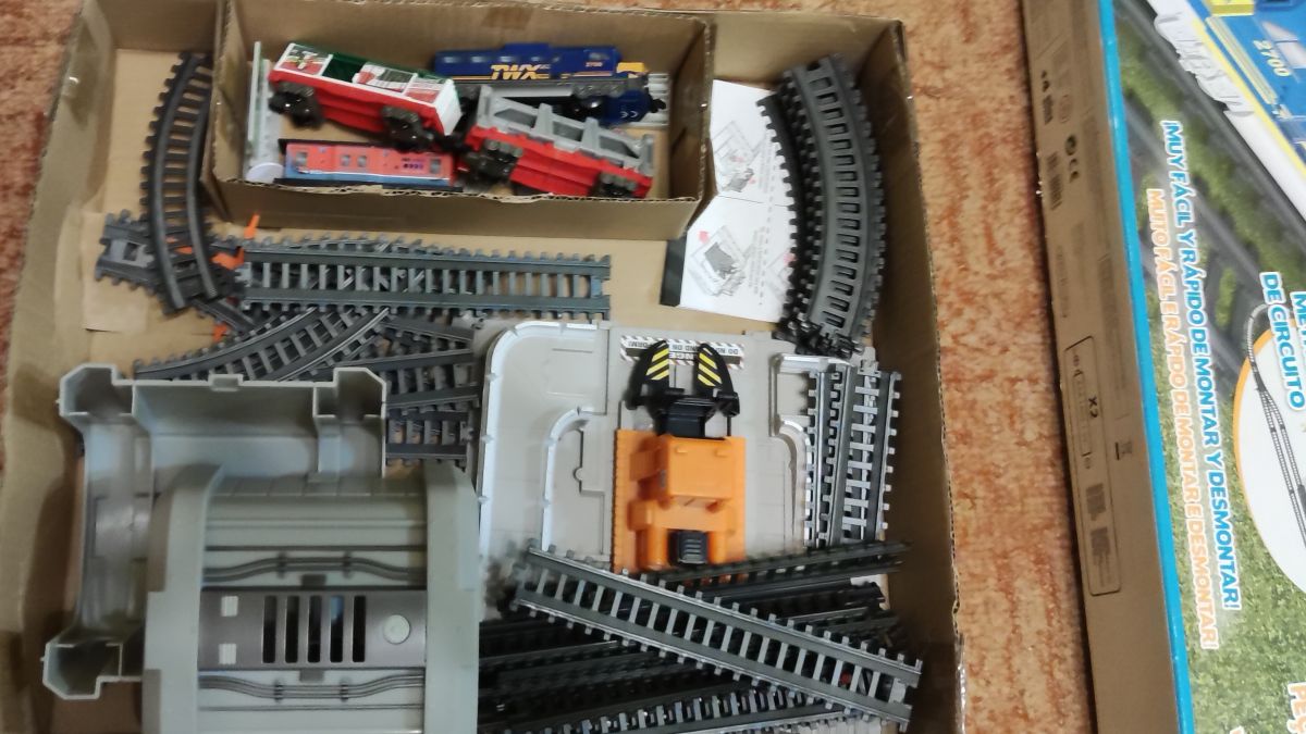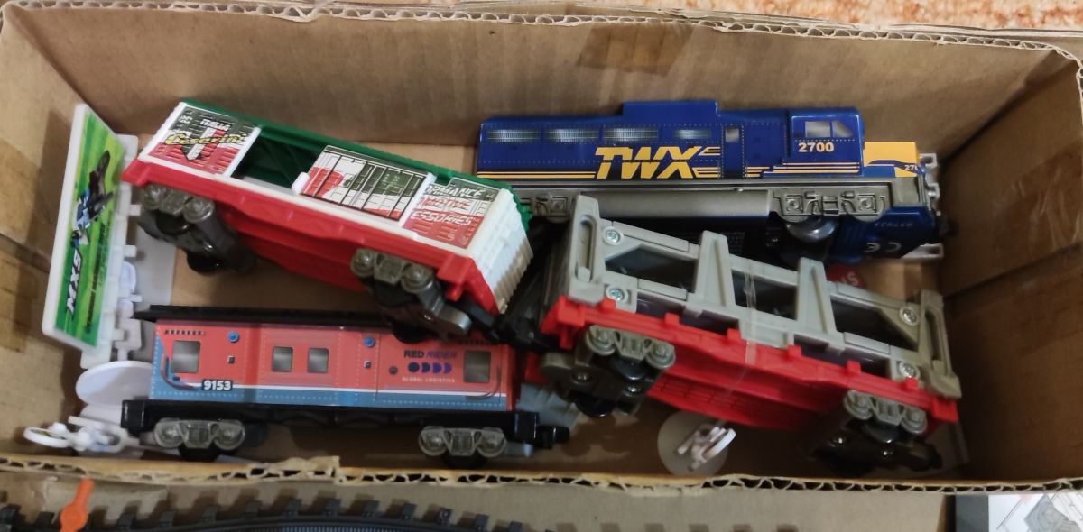 Daruji za odvoz vláčky. Lokomotiva funkční (na baterky), tři vagonky. Nejsou tam všechny dílky, ale okruh se postavit dá.