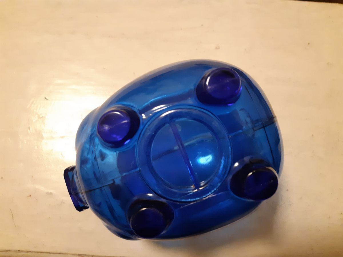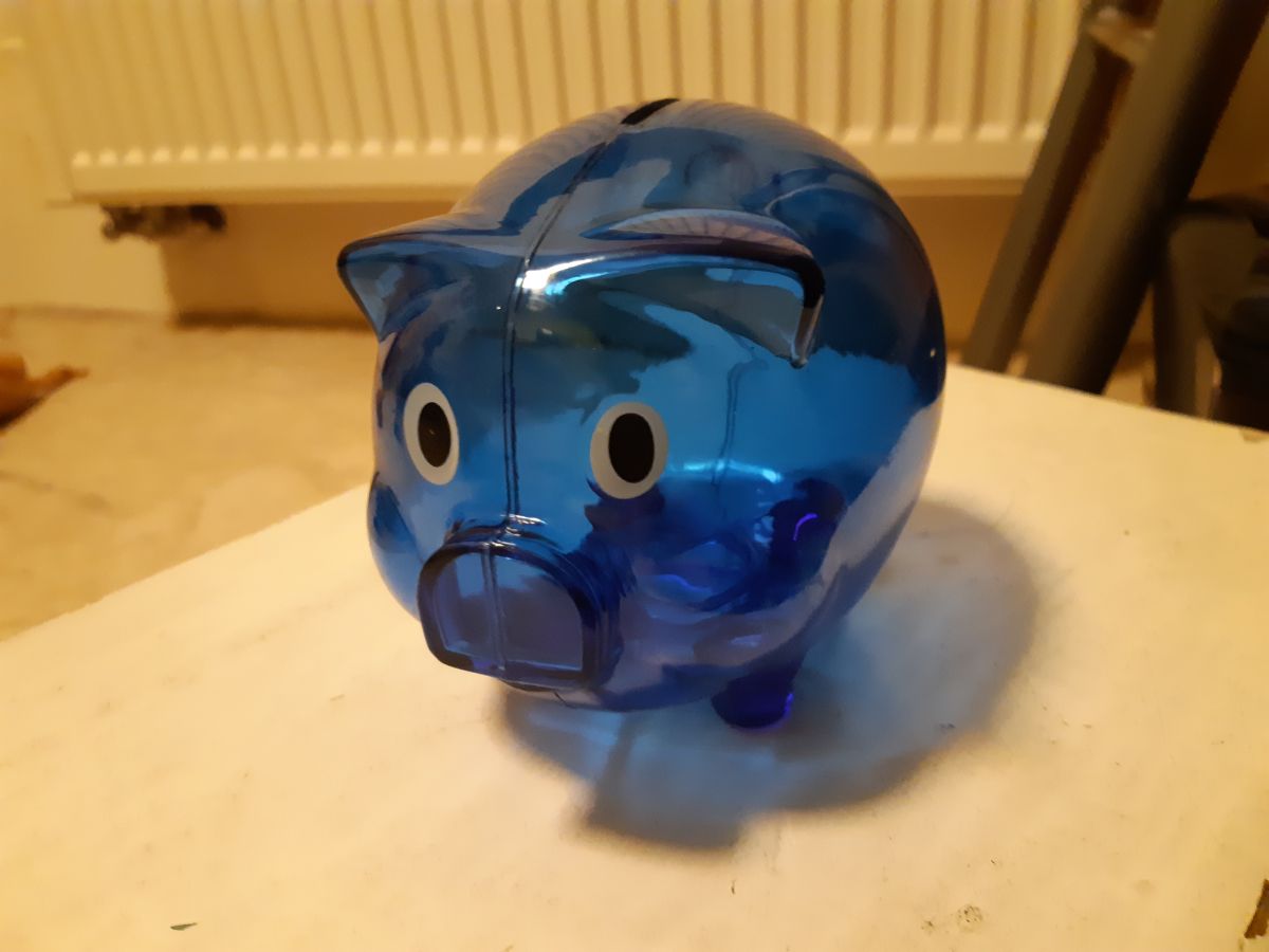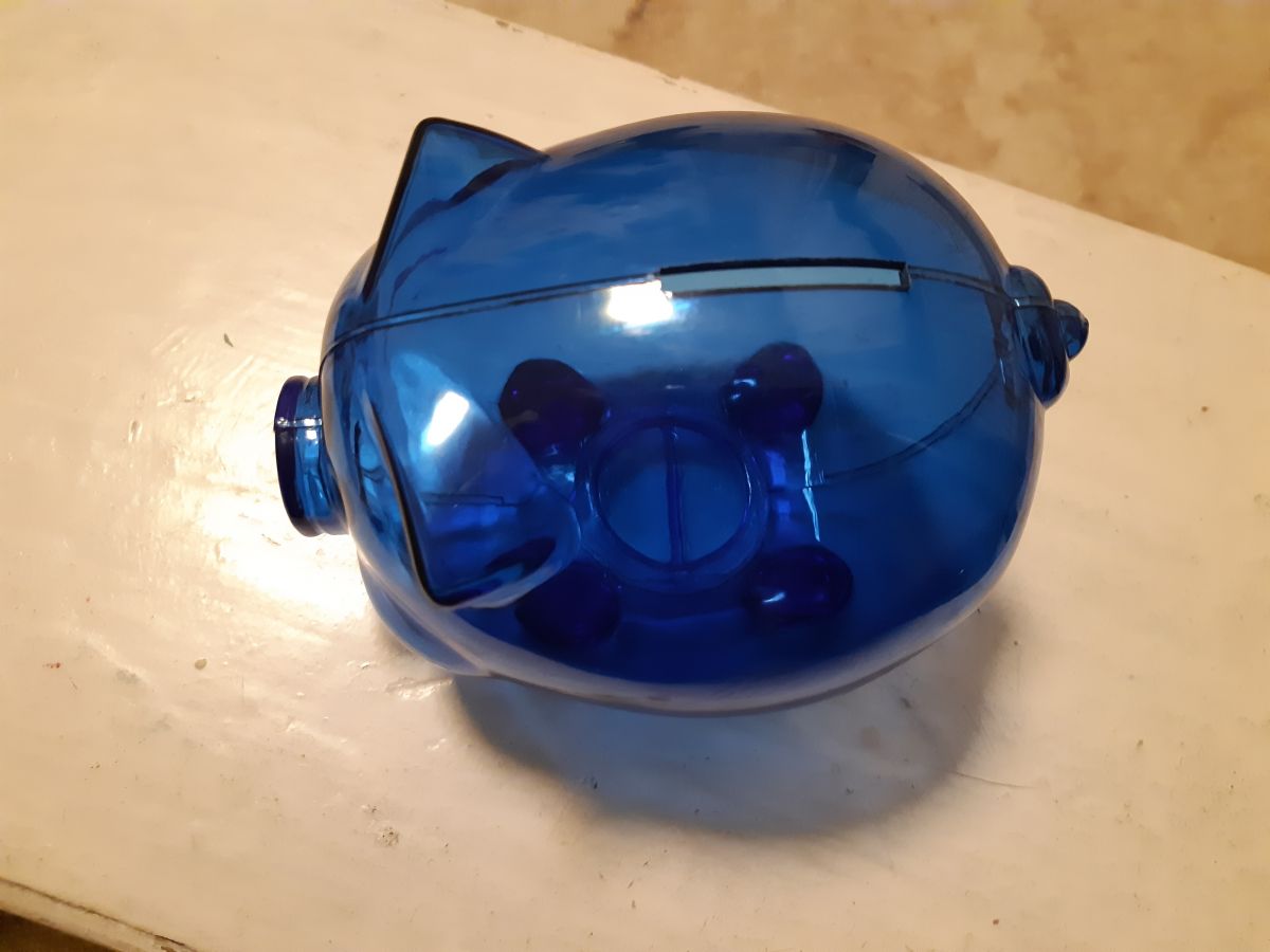 Daruji za odvoz modrou průhlednou kasičku ve tvaru prasátka. Je starší, malinko ošoupaná, ale viditelně jen pod světlem.