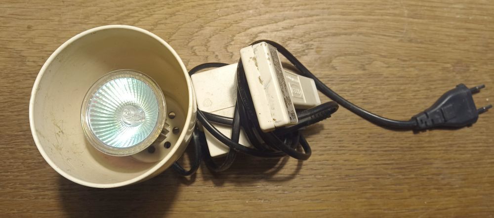 Svítidlo s vestavěným trafem na halogenovou bodovku GU5.3 / MR16 - 12 V, až 50 W (momentálně je tam 35 W). LEDové bodovky fungují jen když určeny i pro střídavý proud, jinak blikají.
