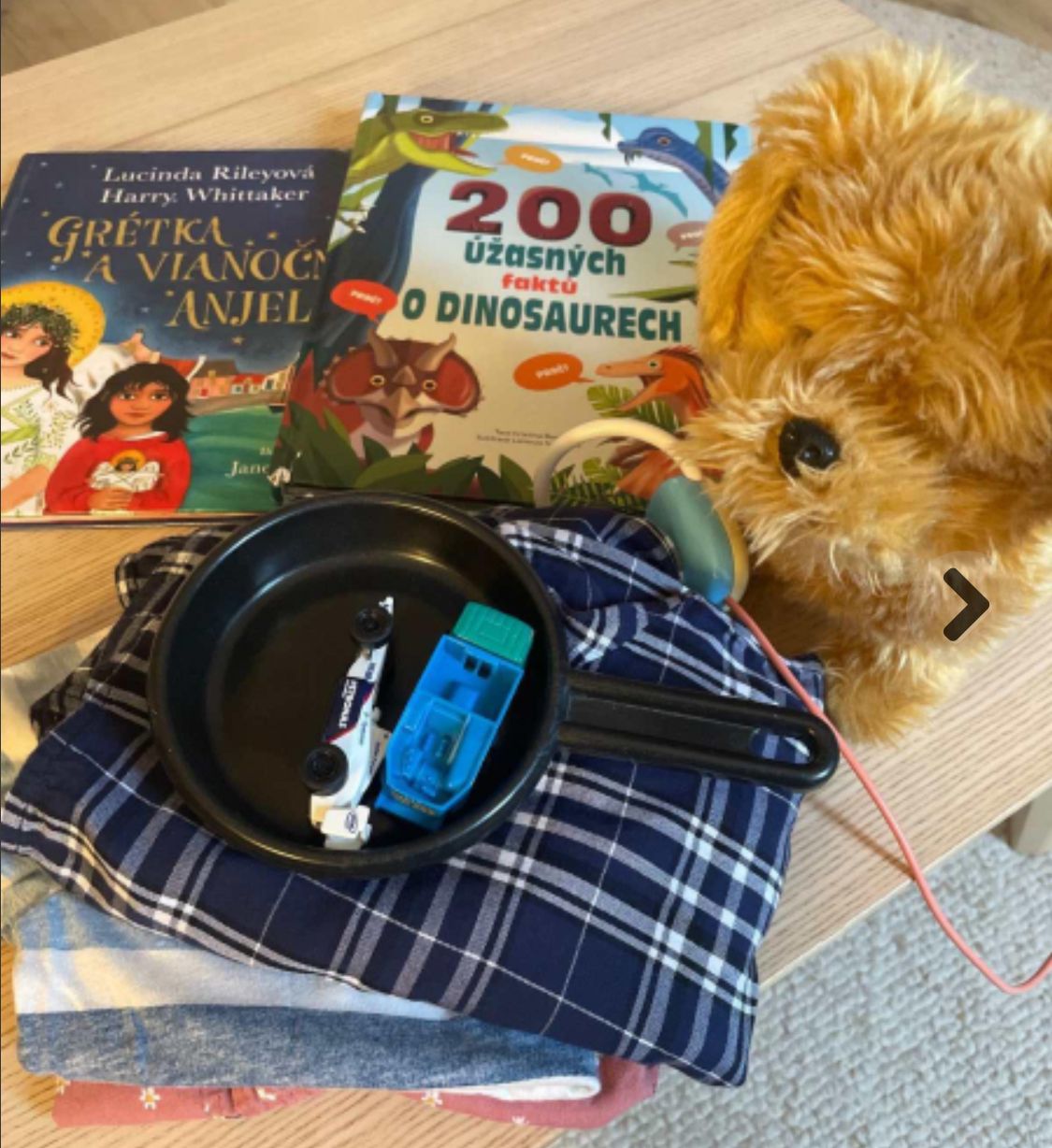 Ako celok deti vyřazovali a udelali krabičku, chcú nekomu udelat radost:) je tam holcici halenka veľkosť 128, klucici triko 6-8, víz foto, plyšový pejsek na voditku, dvě knižky hezke,nezničene jedna o dinosauroch, druha o Vanocich