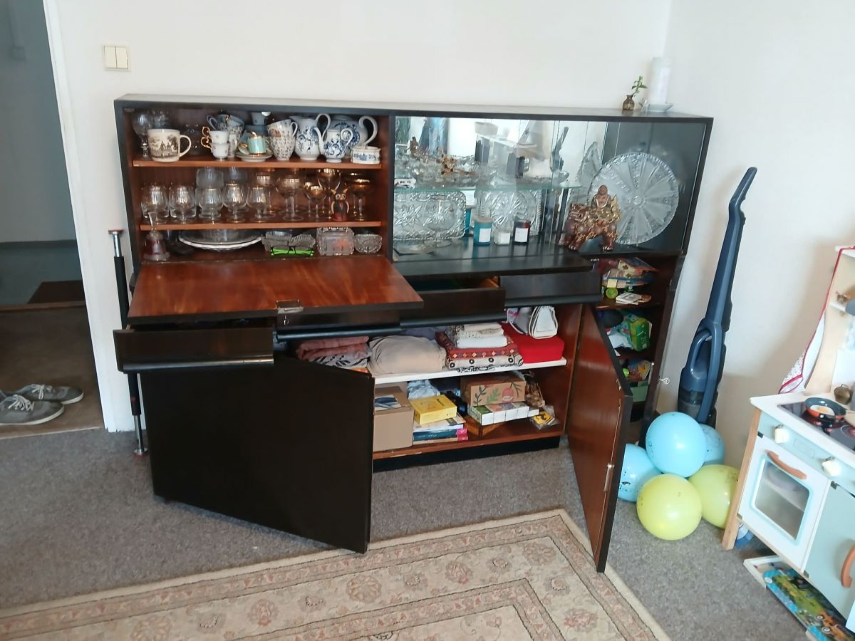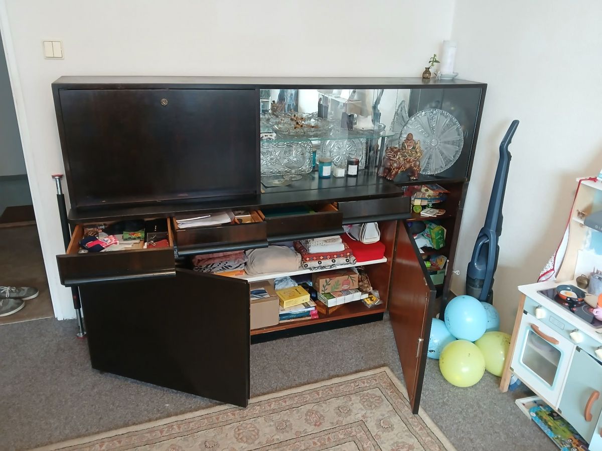Starožitný sekretář za odvoz. Výška 126cm, výška po šuplíky 77cm, šířka 197cm,hloubka 51cm, užší část 35cm. Kredenc po babičce, za odvoz z Pankráce, je v 8. patře (v domě je výtah, ale nejsem si jistá, zda se tam vejde). Tři šuplíky potřebují opravu, vypadávají kolejničky. K převzetí bude samozřejmě prázdný.