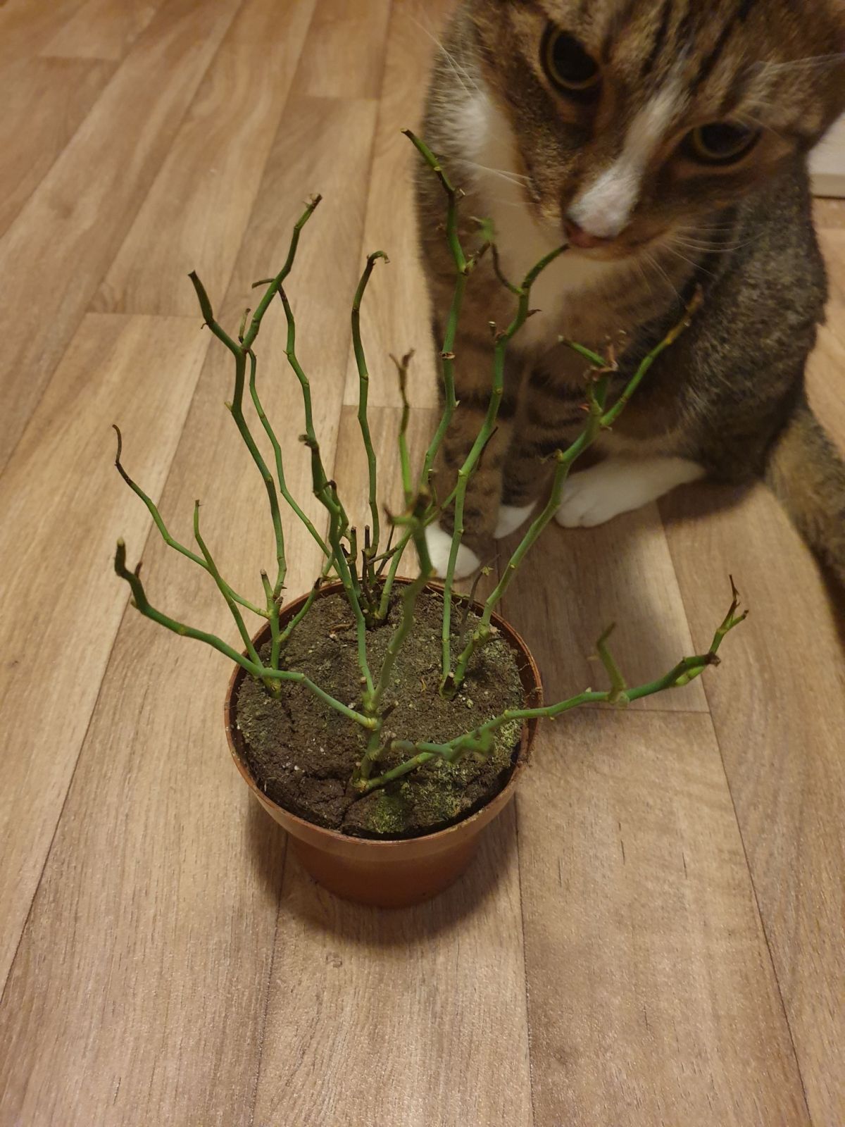 23.12. Jsem dostala krásnou růží v květináči. Během pár dnů uschly listy i květy. Doma na ní bylo moc teplo. Ostříhala jsem jí, ale nemám na ní místo a podmínky. Kdyby si jí někdo chtěl dát na jaře na zahrádku nebo se jí věnovat, přenechám. Myslím, že na jaře zase obroste. Živá je.