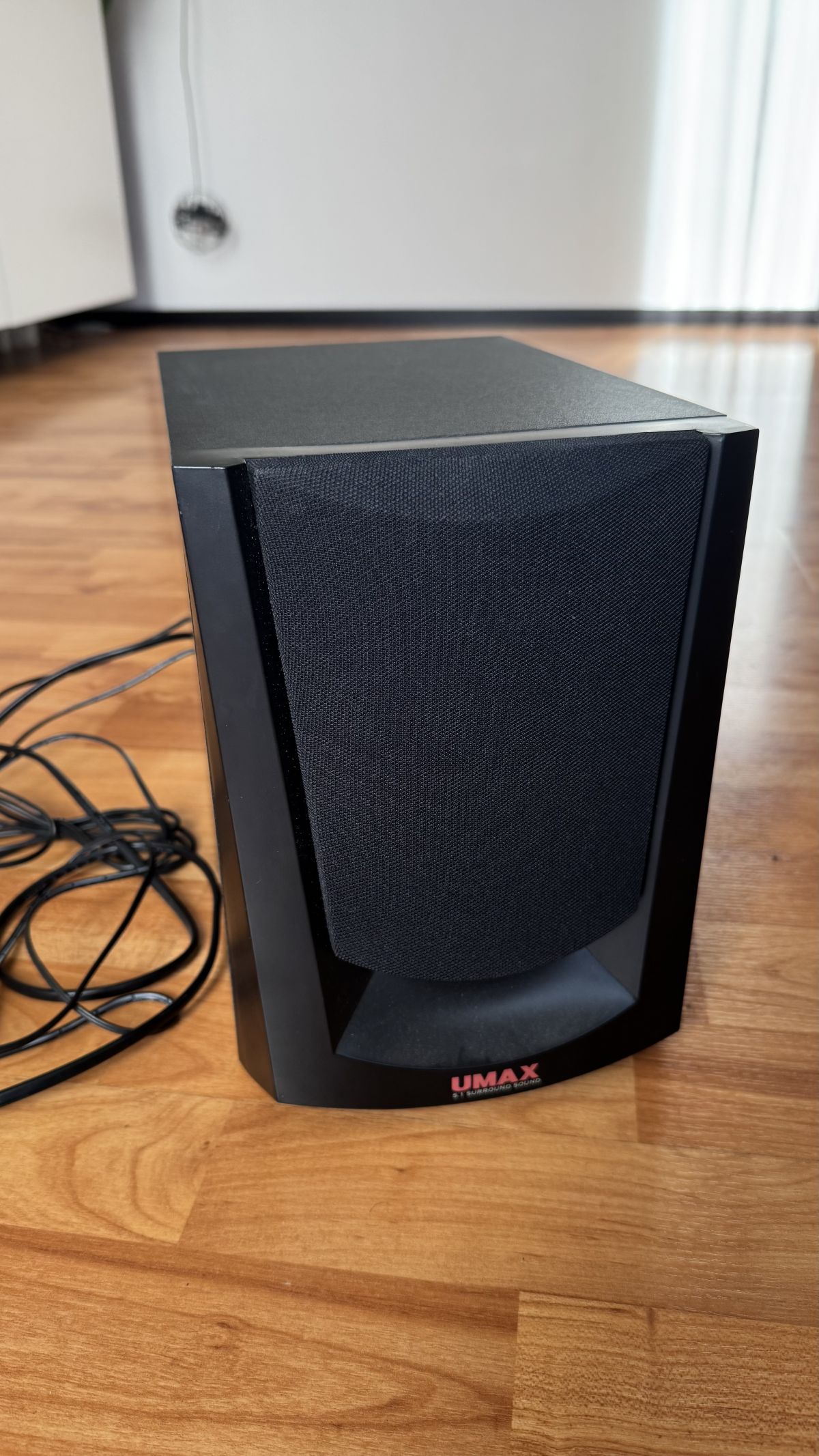 Subwoofer s napájením - zbytek z původní sestavy 5+1 k počítači. Samostatně k ničemu, ale třeba si to někdo šikovný zapojí do nějaké jiné sestavy.