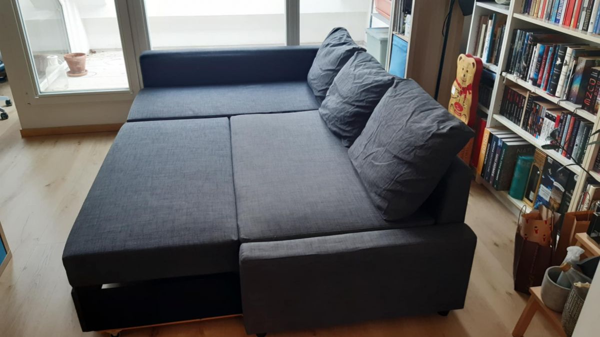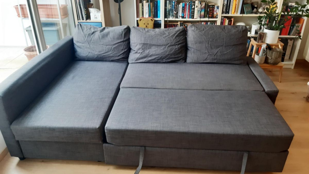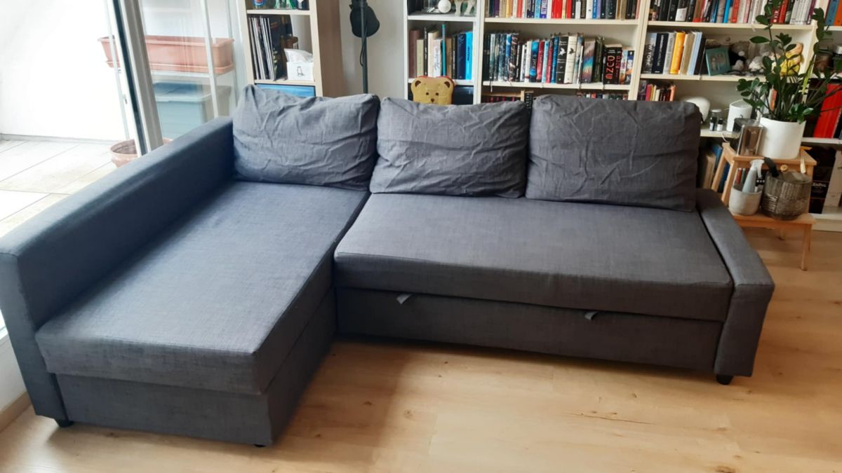 Daruji za odvoz 7 let starou rozkládací pohovku. Na některých místech prosezená a opotřebovaná. Vysunovací část se mírně žmolkuje, drobné nečistoty. Boční opěrka má posunutý molitan vůči vnitřní konstrukci, tudíž se hodí namontovat na druhou stranu než na fotkách. Polštáře jsou zmačkané, jelikož byli zavakuované.