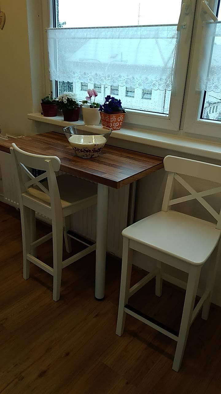 Za odvoz daruji dvě židle (výška 63 cm) a stolek (50×98 cm, výška 86 cm, jde ještě cca o tři cm zvýšit). Stolek má dvě nohy, z vnitřní strany přišroubovaný ke zdi.