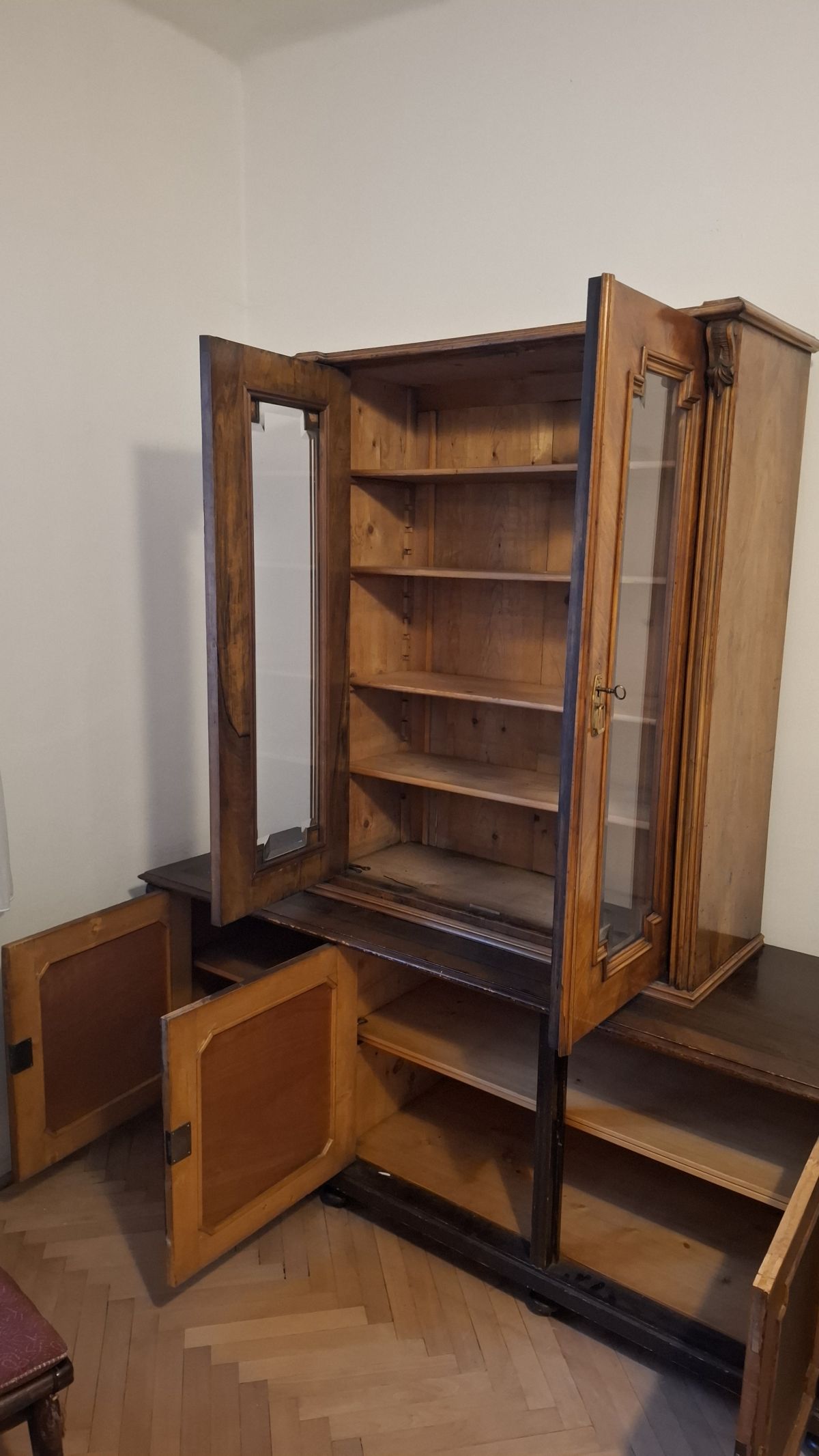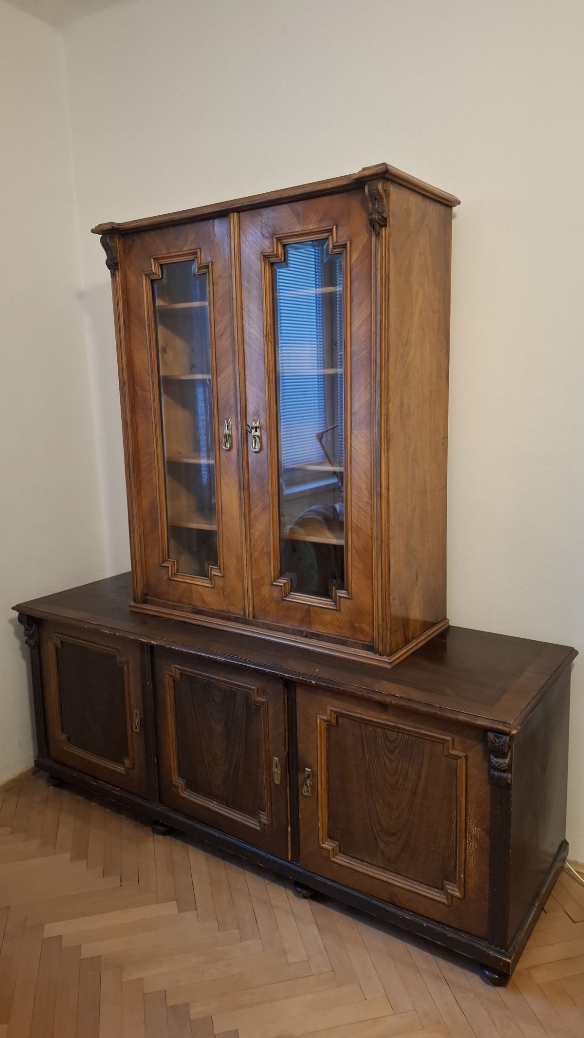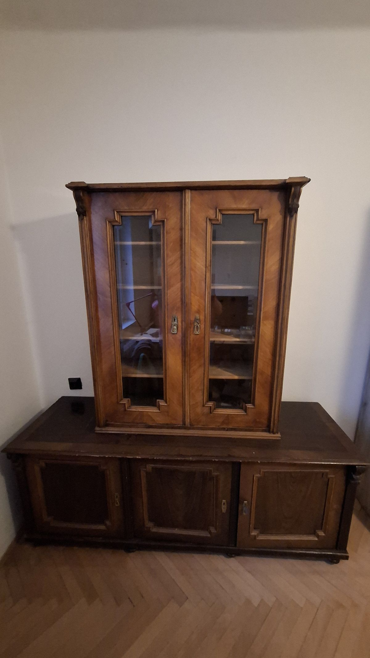 Daruji za odvoz sestavu dvou skříní. Horní skříň s prosklenými dvířky je poměrně zachovalá. Má rozměry š95/v120/hloubka 37cm.