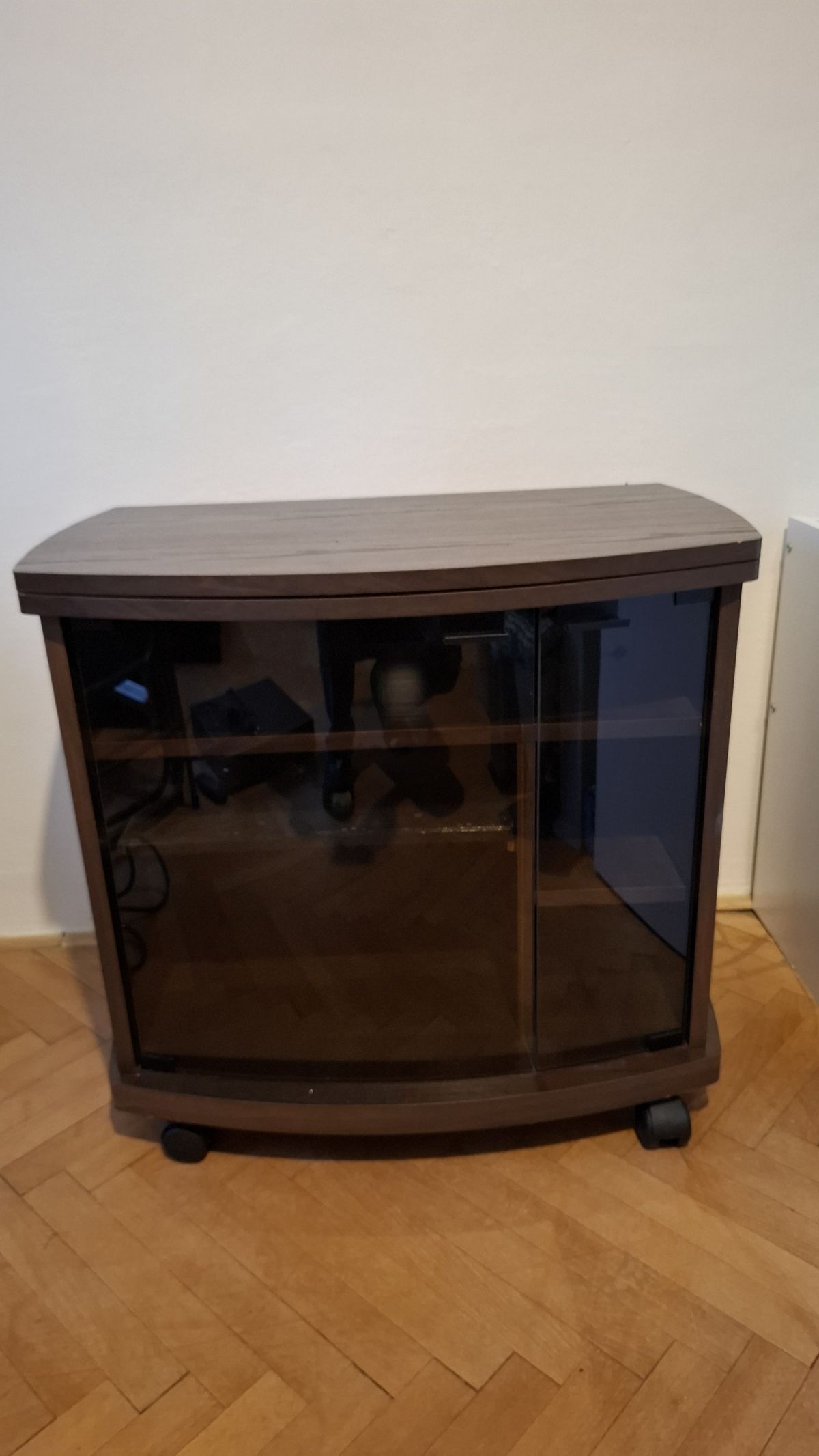 Daruji za odvoz skříňku pod televizi na kolečkách. Skříňka má prosklená otevíravá dvířka, uvnitř poličky. Horní deska je otočná.