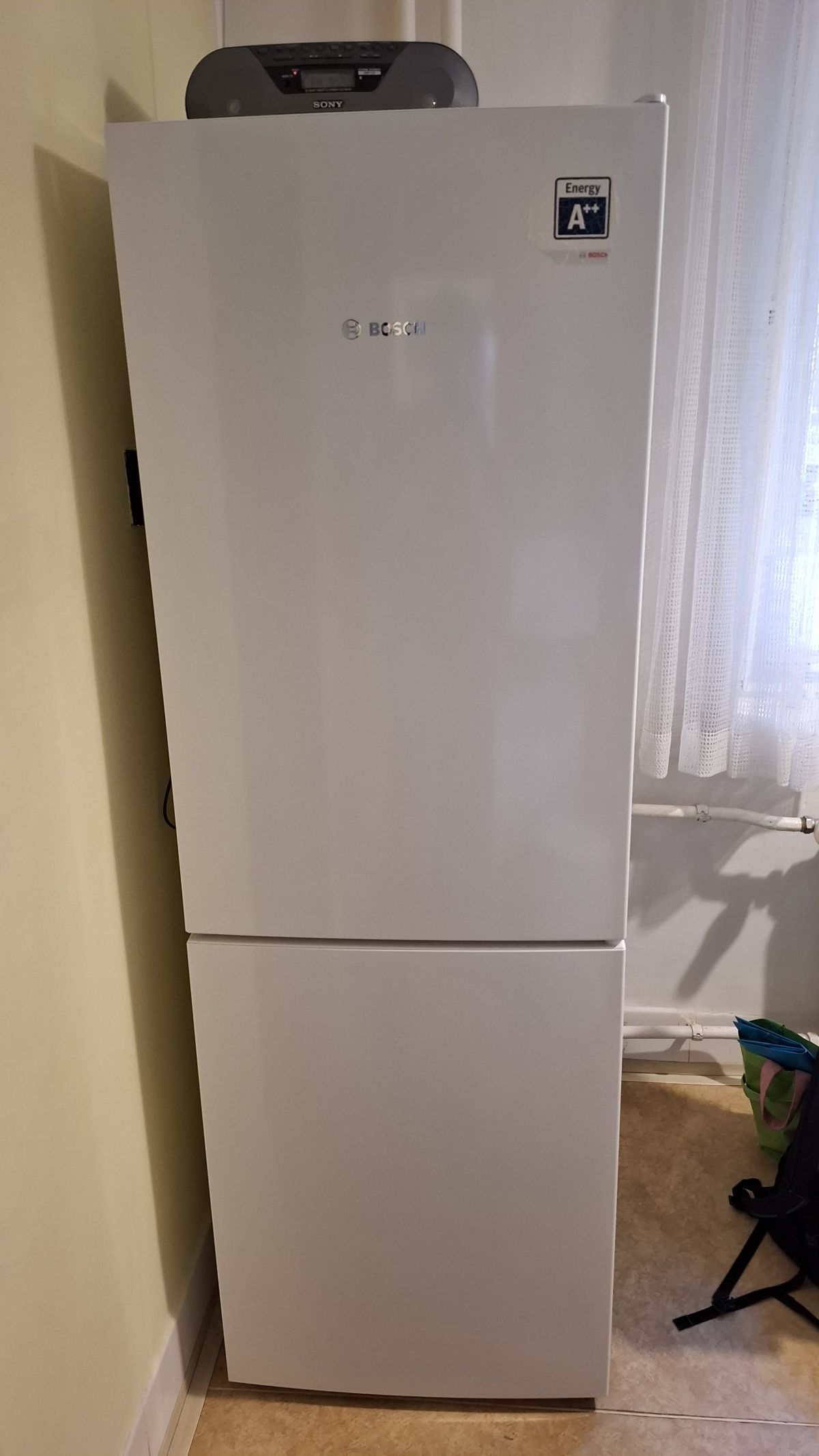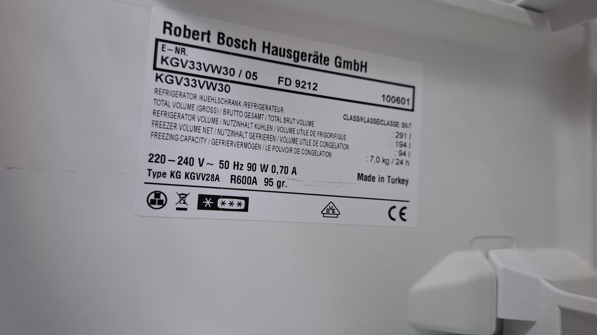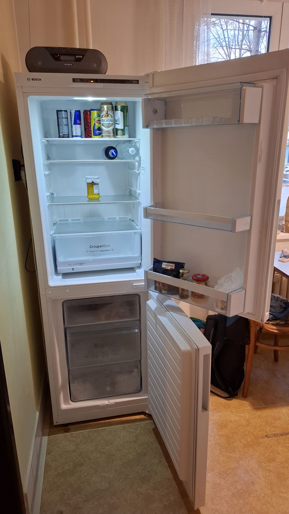 Daruji za odvoz funkční chladničku Bosch. Nohoře lednice, dole za samostatně otevíravými dveřmi je mrazák.