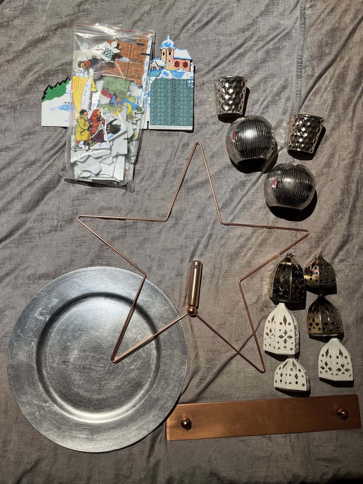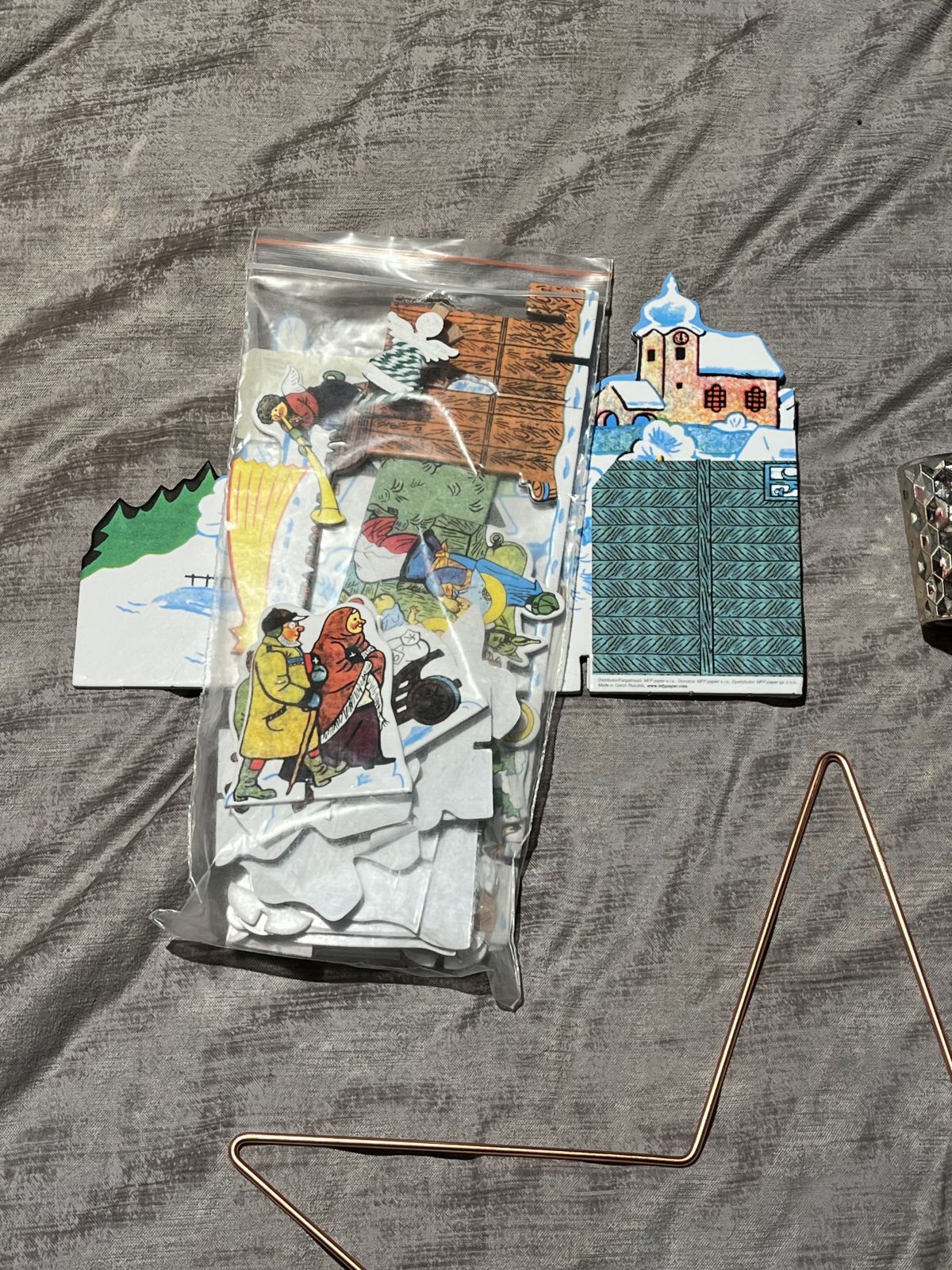 Daruji za odvoz svicny (elektrické i na svíčky), papírový betlém od lady, ozdobný tác