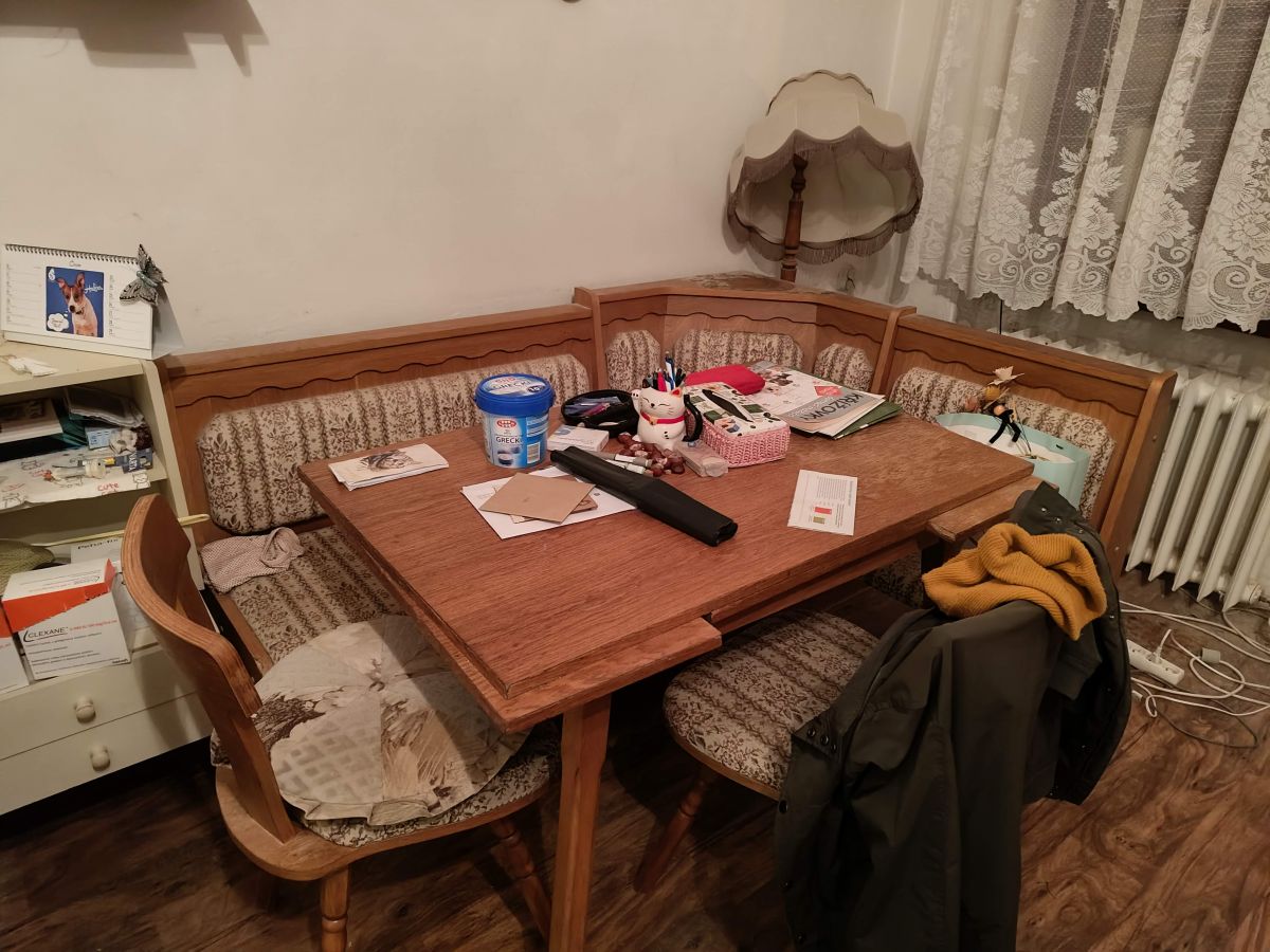 Daruji za odvoz nábytek v rámci pozůstalosti. Lavice je na jedné straně vylomená od zbytku sestavy.