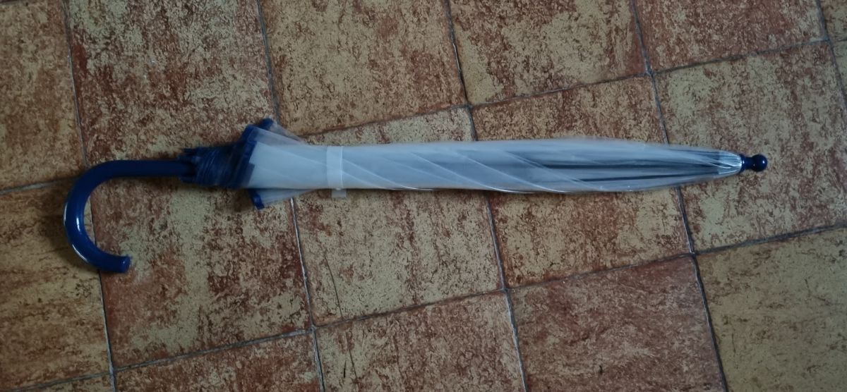 Daruji za odvoz deštník průhledný s modrým madlem.