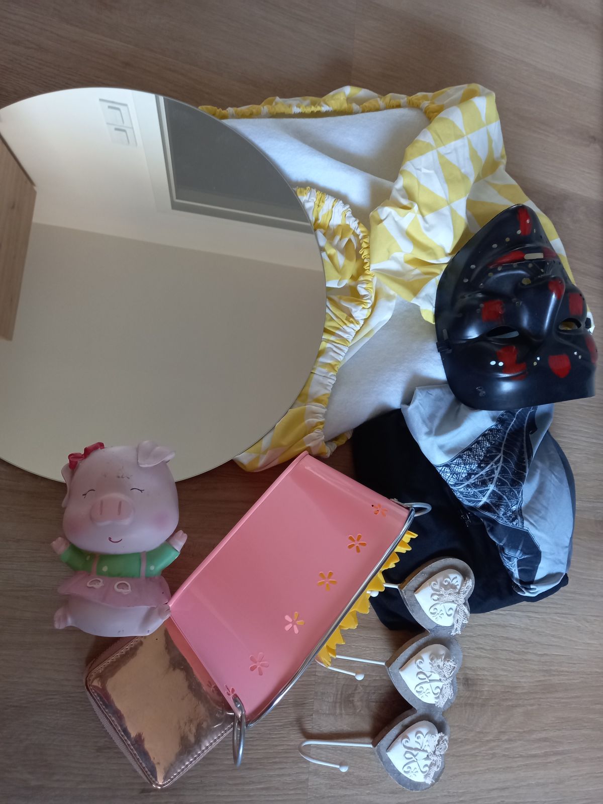Daruji za odvoz ruzne drobnosti viz foto. Kulate zrcadlo, pokladnicka prasatko, penezenka, plastova maska, vesaky, ruzovy a zluty kvetinacek, zluty potah na zehlici prkno, dva chranice na cestovni kufr.