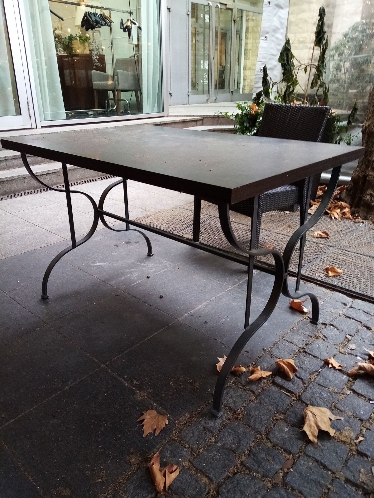 Daruji za odvoz stůl s kovovým podstavcem a masivní dřevotřískovou deskou.