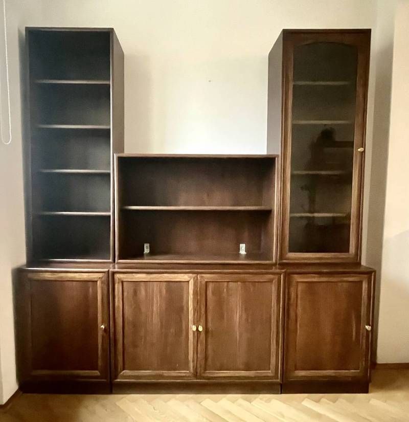 Jedná se o poctivý nábytkový komplet z truhlářské výroby, nikoli o lehký sériový nábytek. Velmi stabilní, těžké korpusy, masivní rámy dvířek, skleněné vitríny.