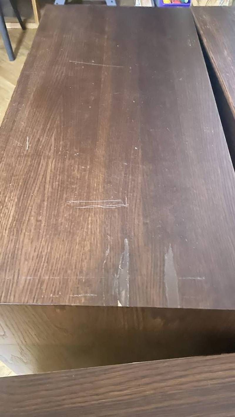 Konstrukčně pevná, funkční. Povrch běžně opotřebený, horní desky dolních skříní mají výrazné škrábance a skvrny, viz foto. Skla, panty i úchytky v pořádku.