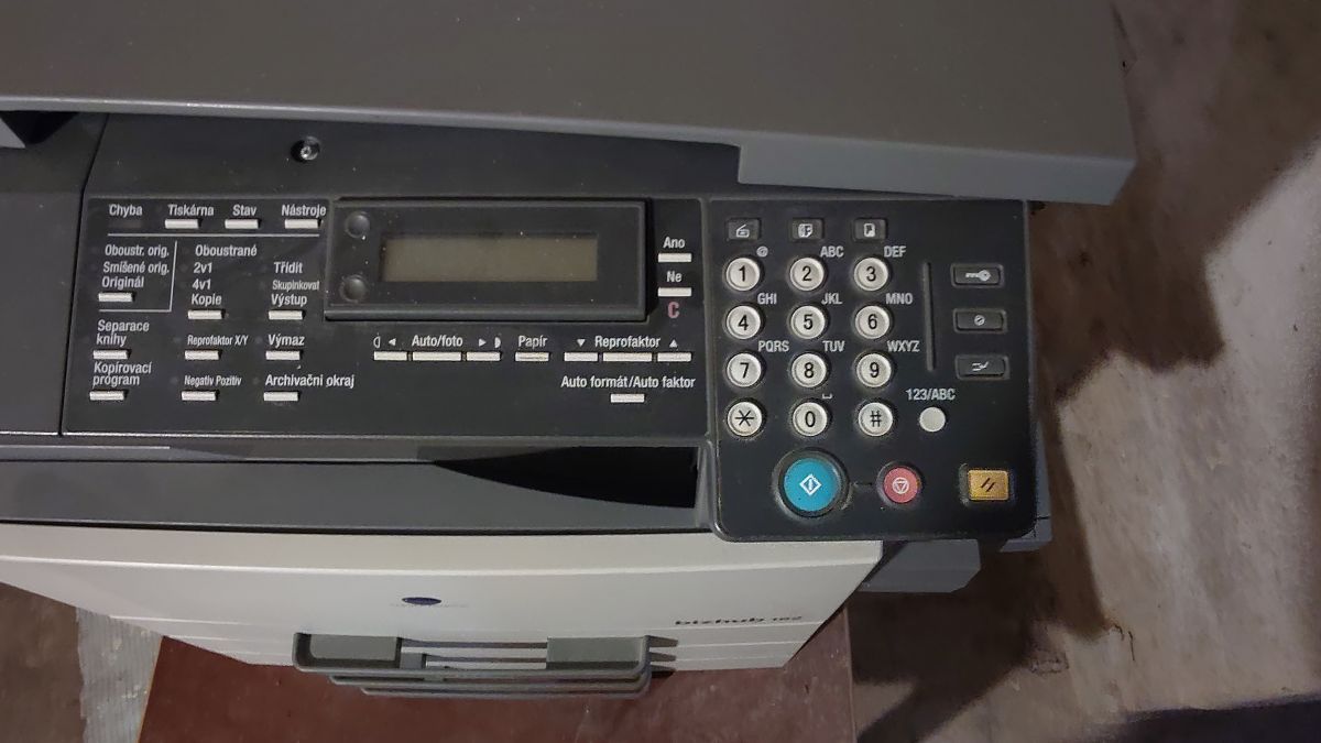 Starší kopírka a tiskárna A3, černobílá.