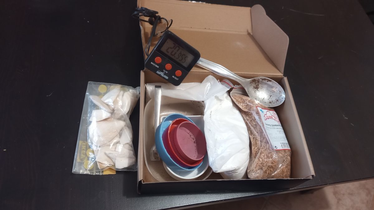 Daruji za odvoz směs doplňků pro chov afrických šneků jako domácích mazlíčků. Je to pár mističek, krmný vápenec, sušený gammarus, pár zlomlků sépiové kosti, lžíce a chňapka pro snažší manipulaci v hlíně a digitální termostat a vlhkoměr - s baterkou, akorát jeho přesností si nejsem tak moc jistá.