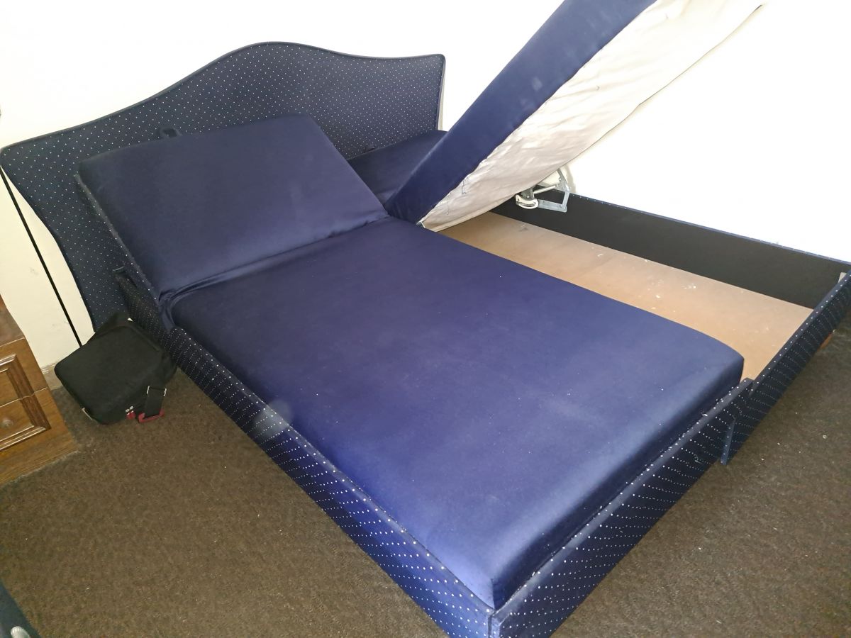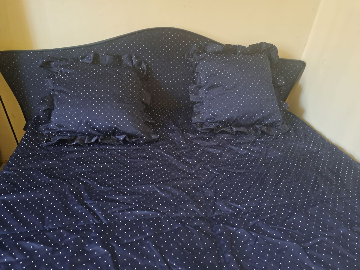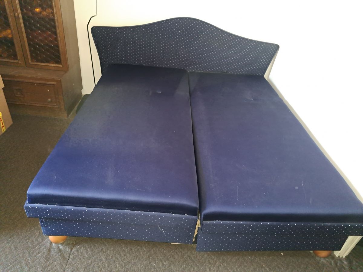 Daruji za odvoz Tmavě modrá, na jednom místě propadlé dno, přehoz a dva polštáře tmavě modré s bílými puntíky