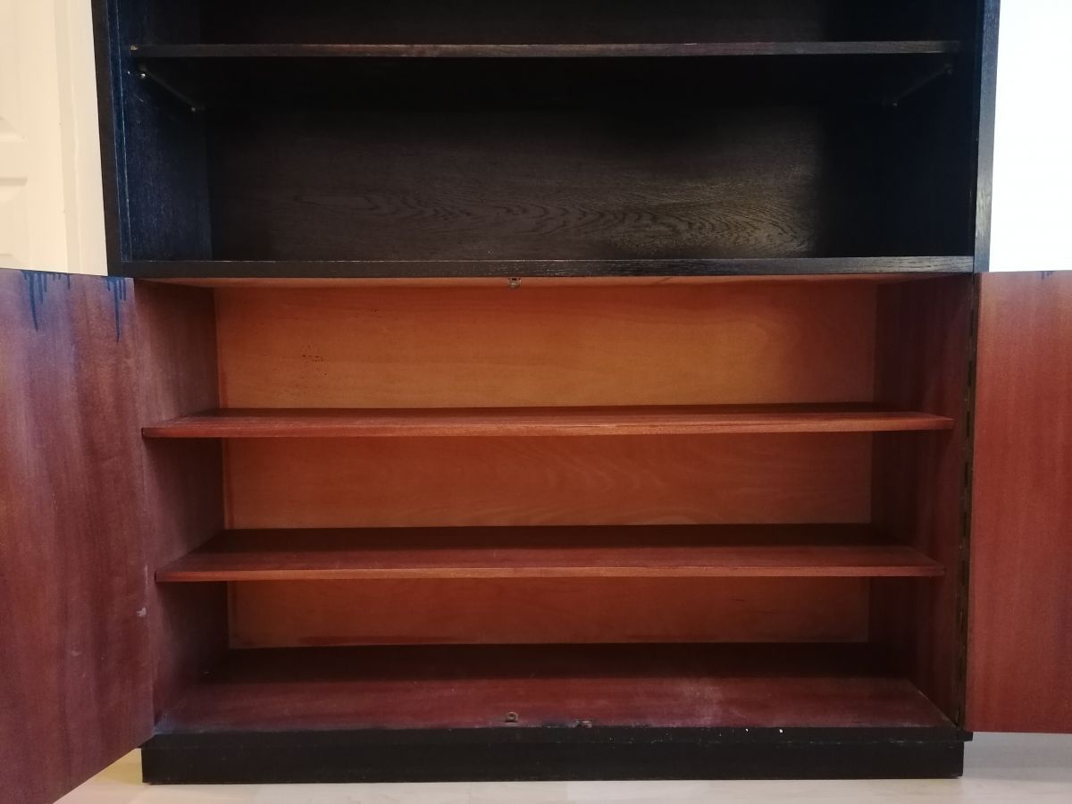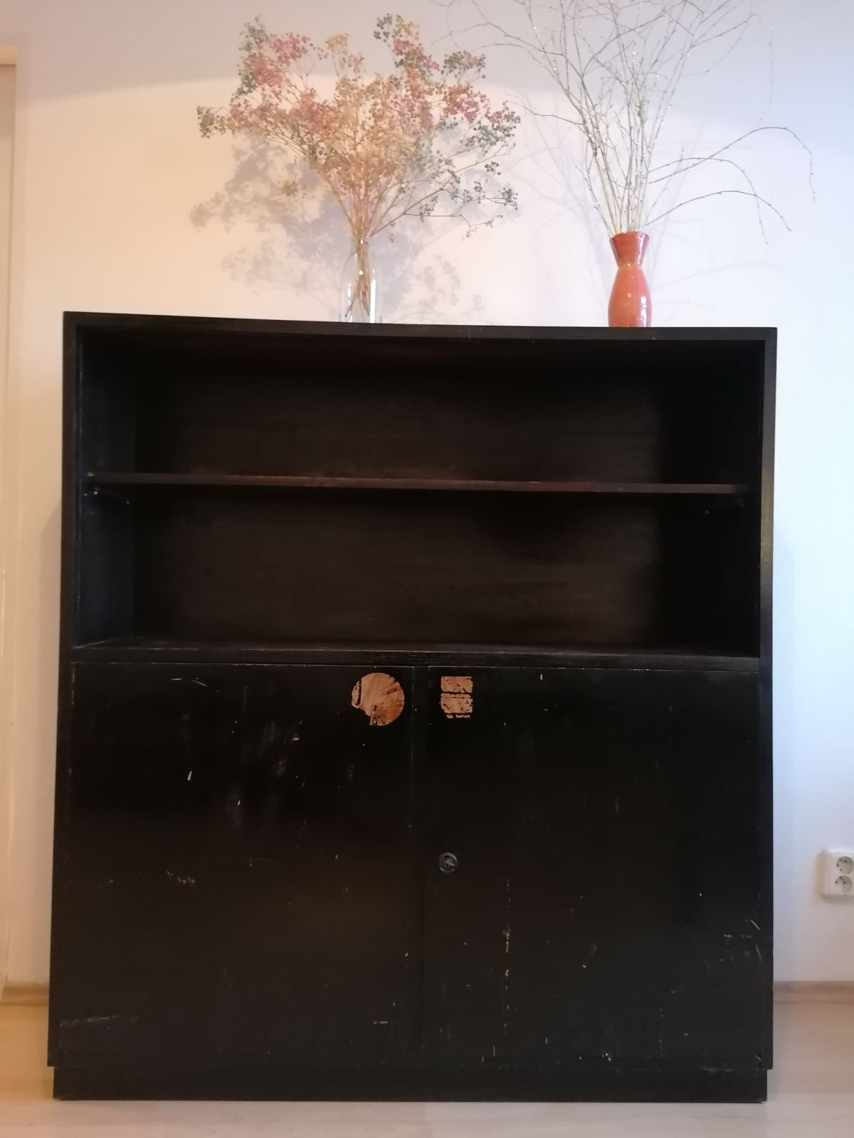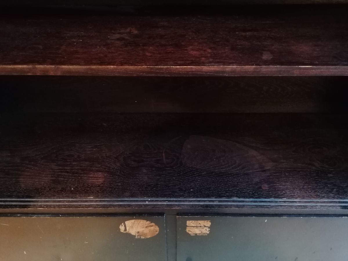 černá skříň ze dřeva, s policemi. Pevná, bytelná, ovšem taky s lakem místy poškozeným. U nás sloužila jako úložný prostor na chodbě, kde nebylo na ní moc vidět, ale po broušení a natření by určitě měla šanci na lepší život. K té horní výlohové části mám jedno sklo, viz. foto. Rozměry: 133 X 120 X 32 cm.