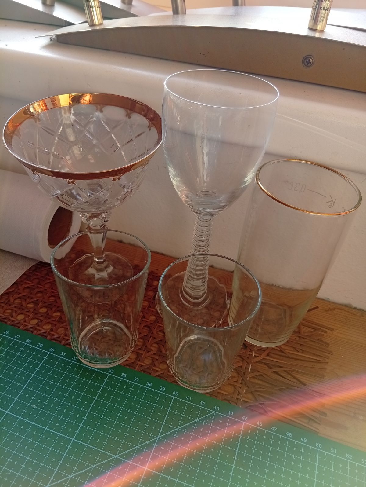 Sklenice, bez ot'uků. Sklenice se zlatém je vadná, křivá.