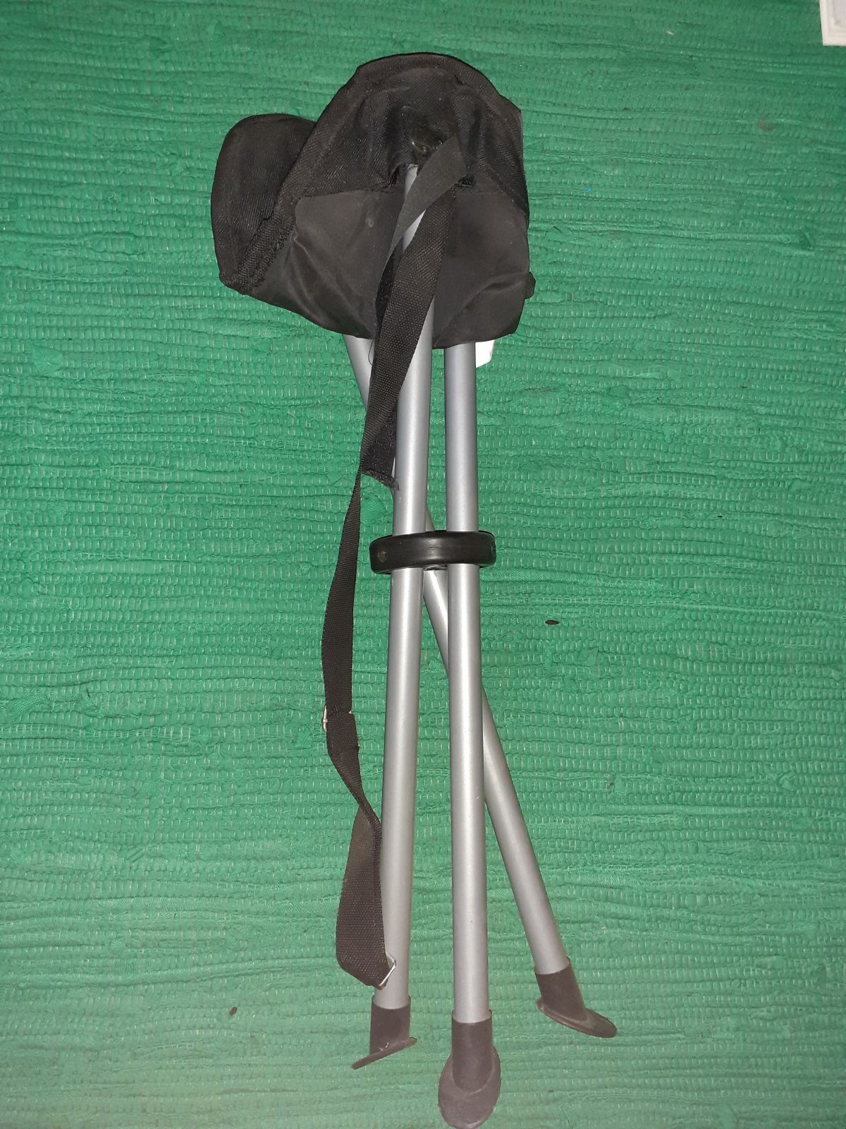 Hliníkové nohy, sedátko pevná, umělá tkanina, popruh na nošení, výška cca 40 cm.