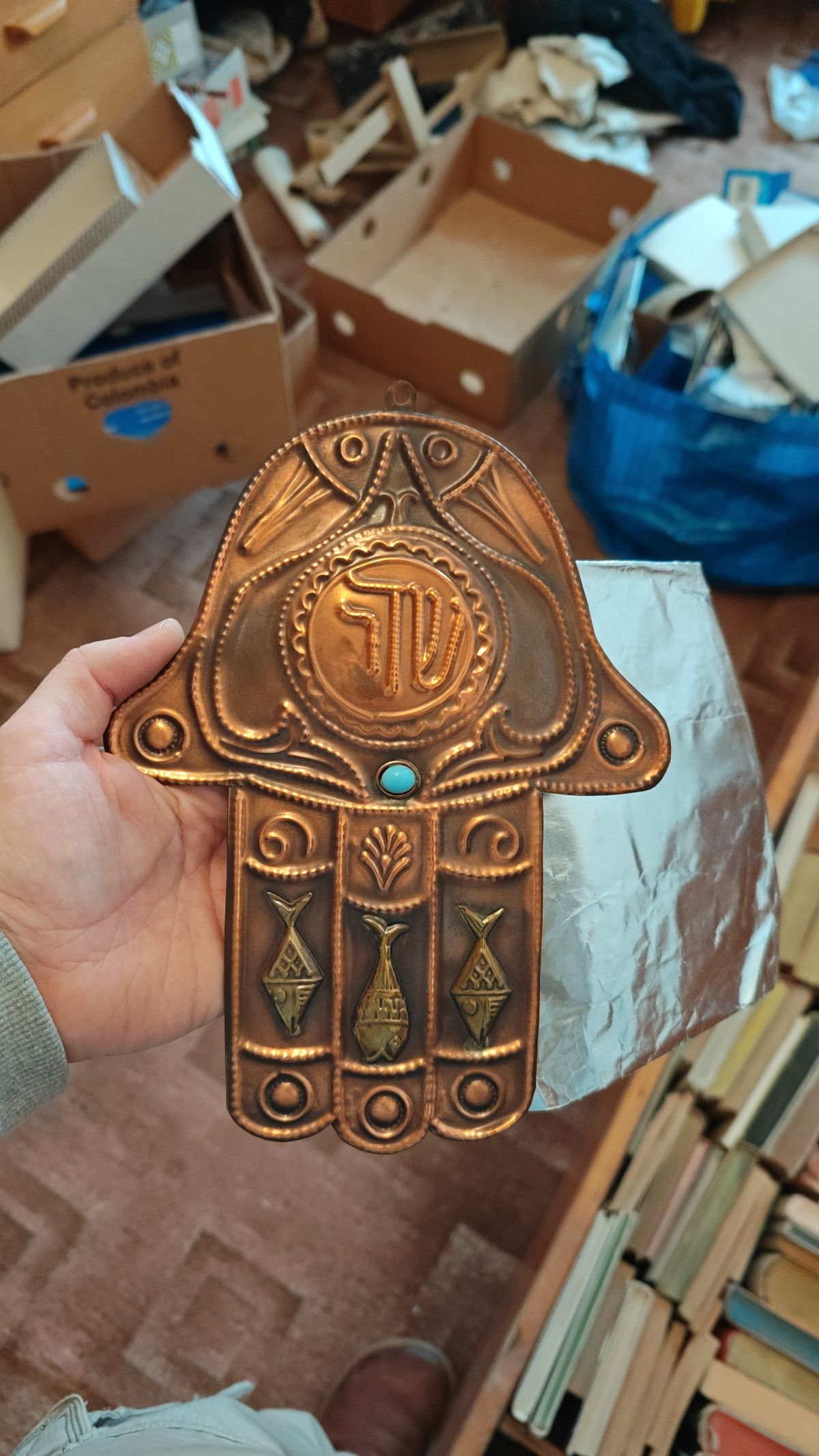 Daruji za odvoz měděnou dekorací Hamsu (ruka Fatimy)