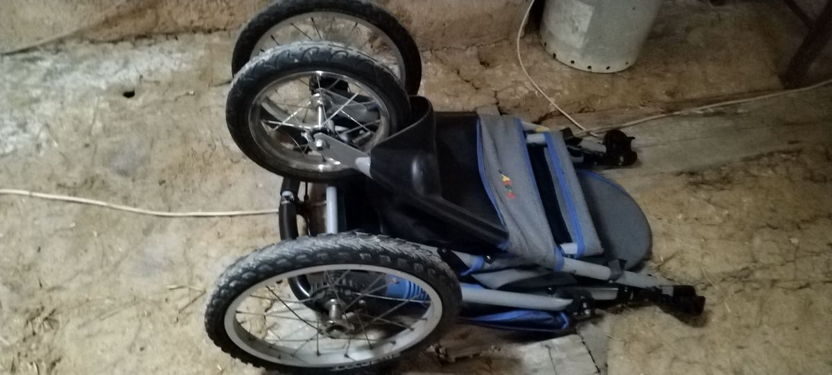 Daruji za odvoz. Je uz na nem videt stari, paradu nedela, ale do lesa a na chalupu neznam lepsi. Ma velka kola, je lehoucky, projeli jsme s vnukem i vysokou travu. Neda se sedacka uplne polozit na spani, takto jsme ho jiz zde dostali. Koupili jsme nove duse. Kdyby ho jeste nekdo chtel do lesa vyuzit, nez ho poslu do SD. Brzdy i na rukojeti, skvele funguji.