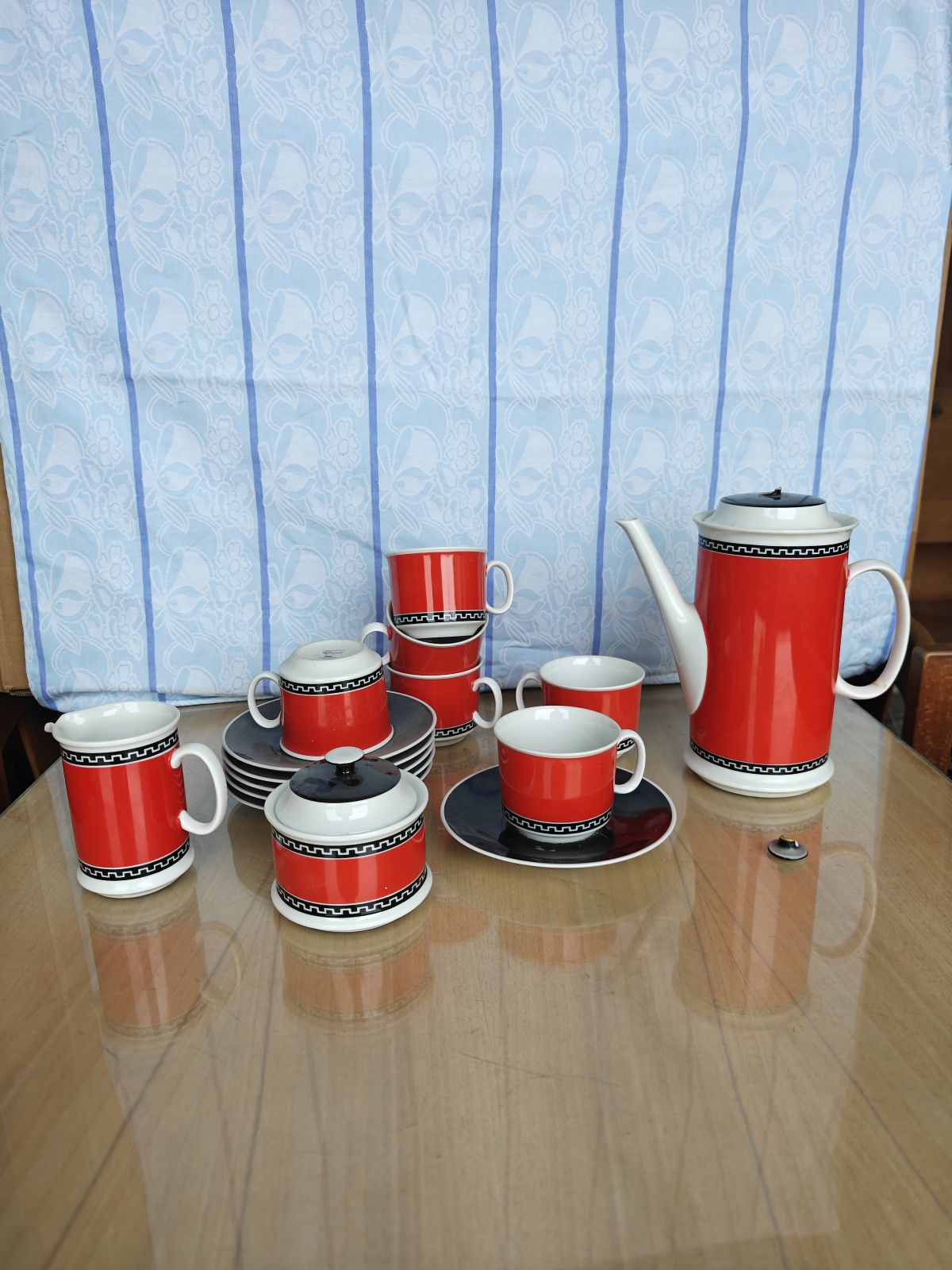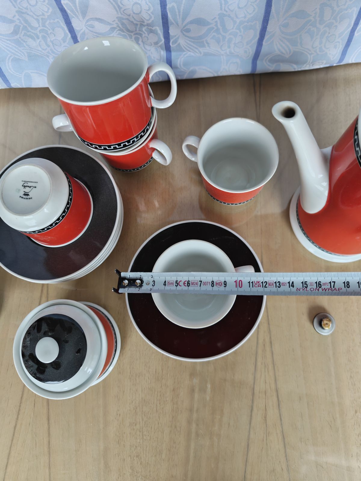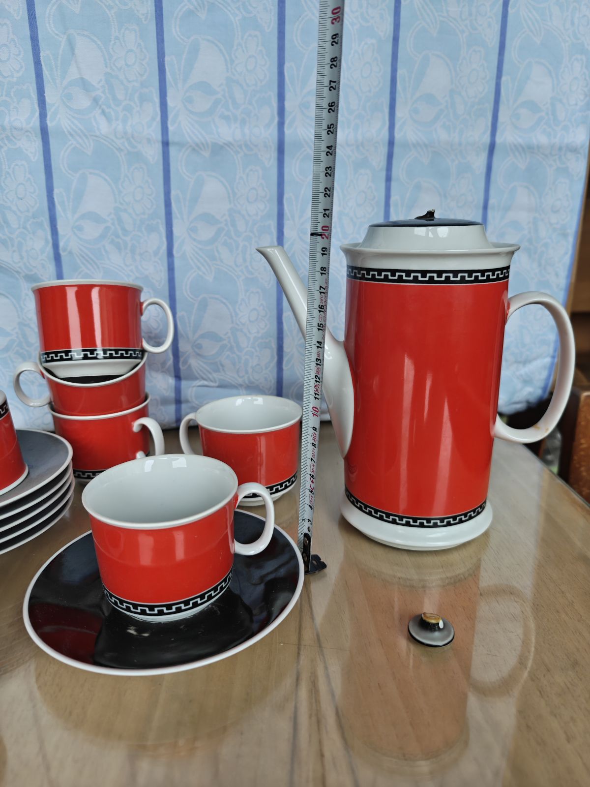 Červená čajová sada, pozor konvice bez poutka