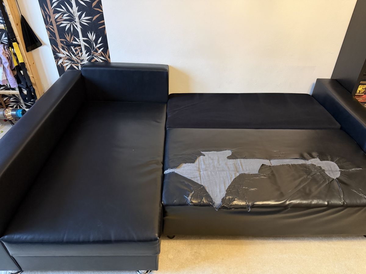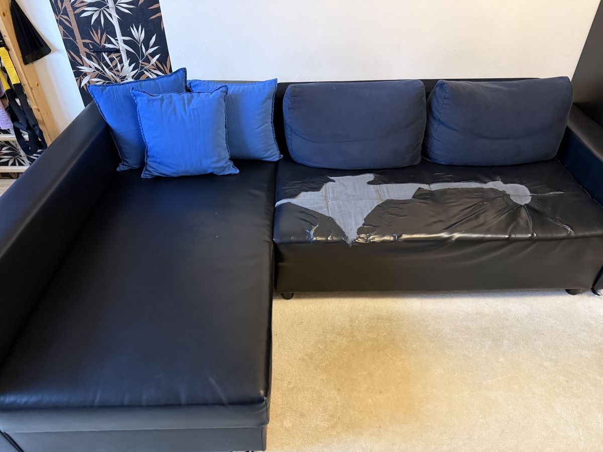 Je starší/používaný, ale stále funkční. Dvě části jsou přečalouněné. Jednu sedací je potřeba si opravit nebo přikrýt dekou.