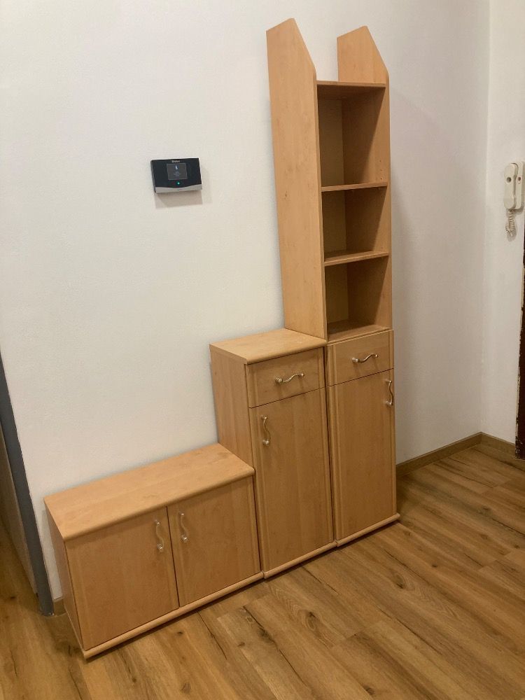 Skříňky a zrcadlo do předsíně, jde libovolně kombinovat, rozměry skříněk v plánku. Ke stěně je i zrcadlo, rozměr desky zrcadla 34 x 89,5.