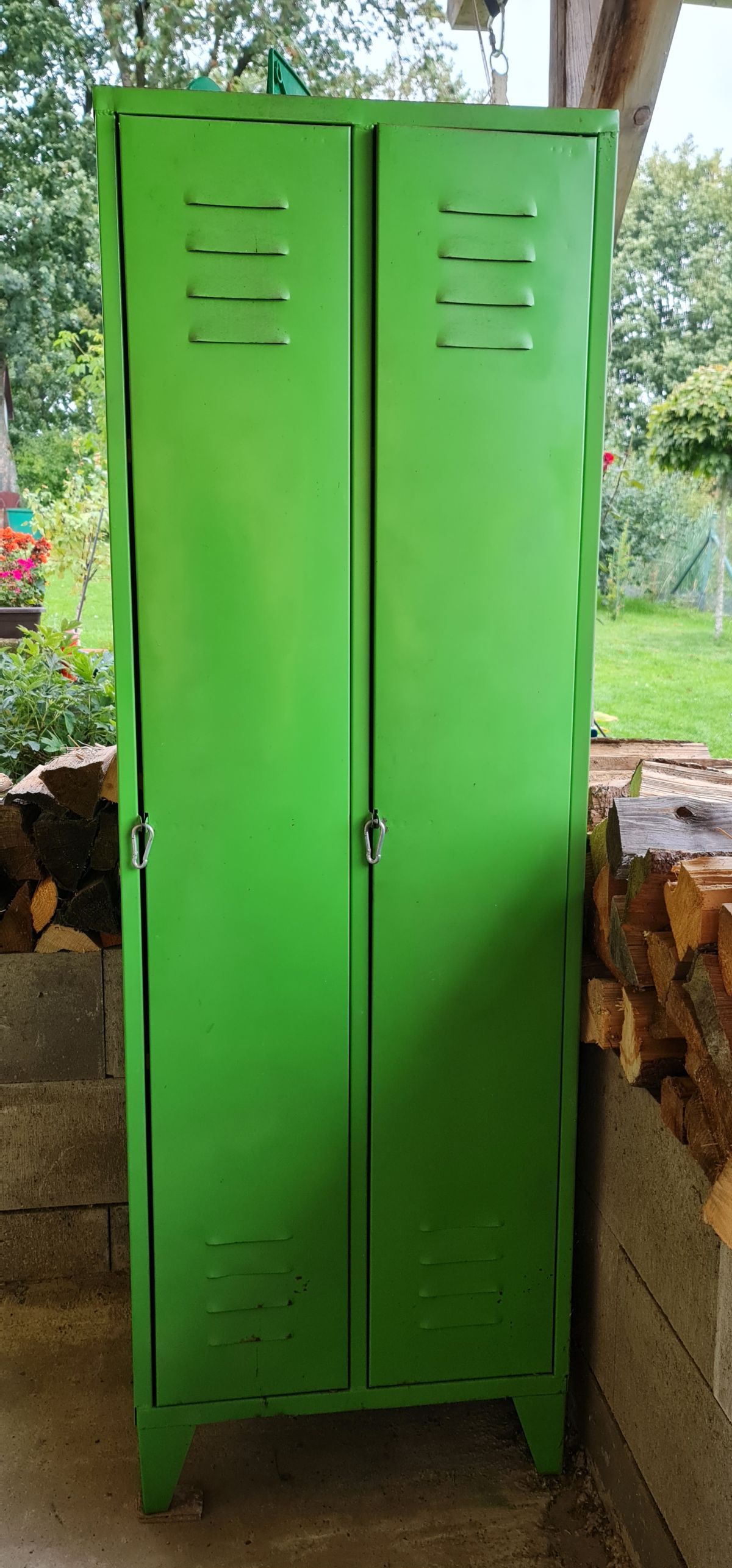 Klasická plechová šatní skříň předělaná na regály.