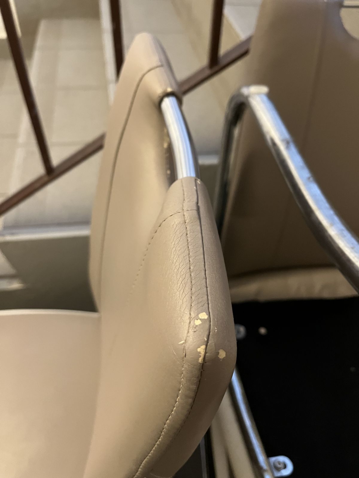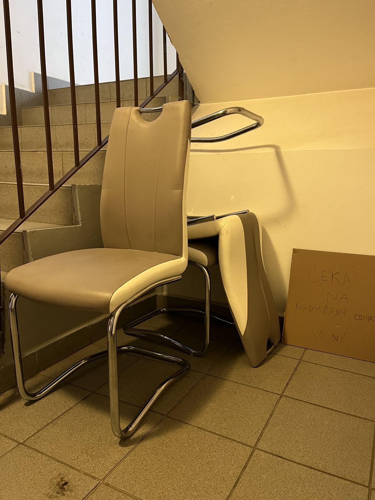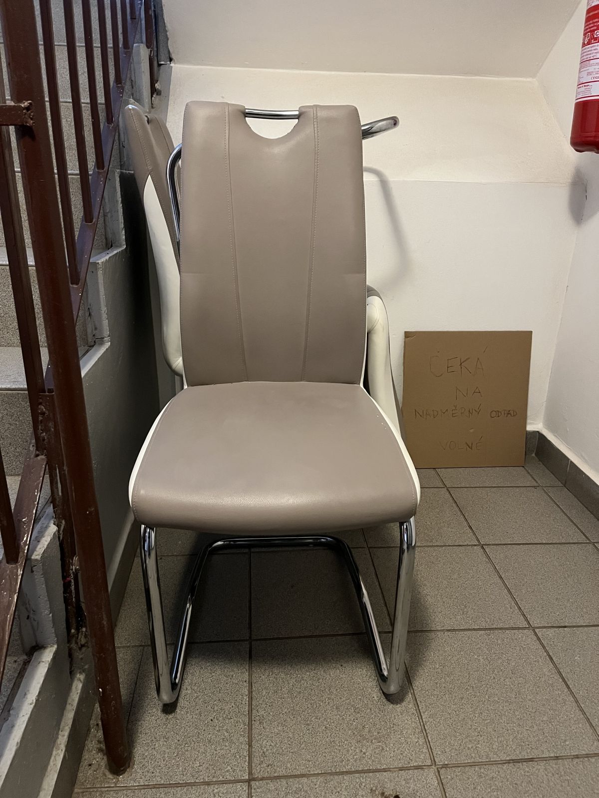 Tři starší, ale zcela funkční židle. Opotřebení je vidět na detailní fotografii. Soused je nechal ve společném prostoru domu s tím, že čeká na velkoobjemový kontejner, takže jsou k dispozici. Radši ať si je někdo odveze a využije, než aby skončily kdo ví kde…