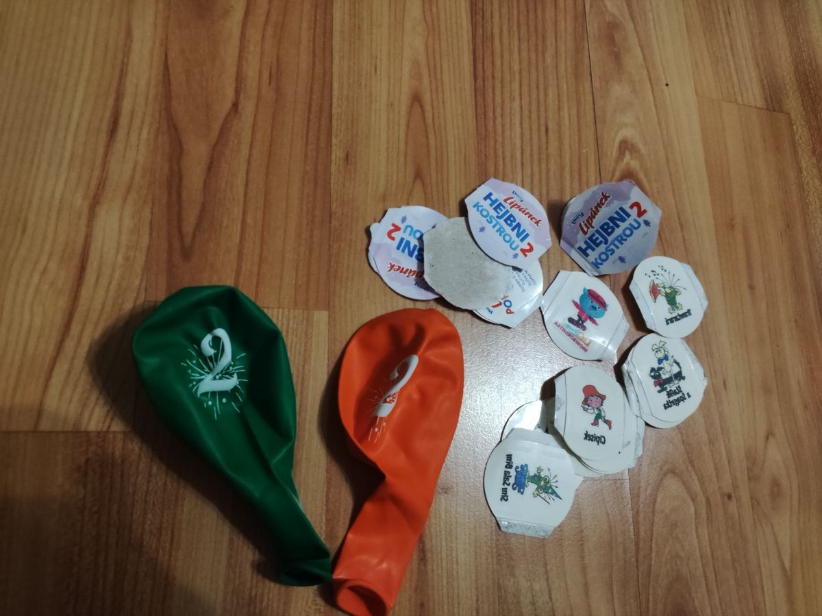 2 balónky s číslem 2 a tetovačky z jogurtů