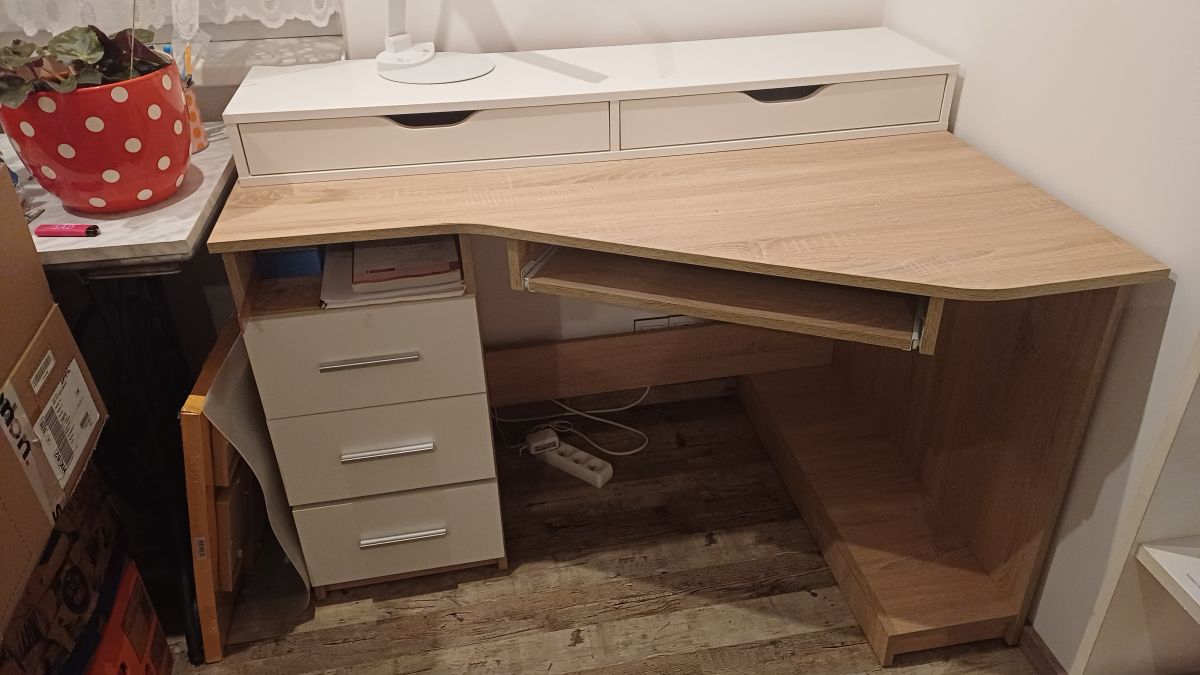 Daruji rohový psací stůl se zásuvkami v barvě dub sonoma/bílá. Délka 120 cm, hloubka 50-85, výška 76 cm bez bílého nástavce na desce stolu. Pěkný stav. Osobně v Postřižíně u Kralup.