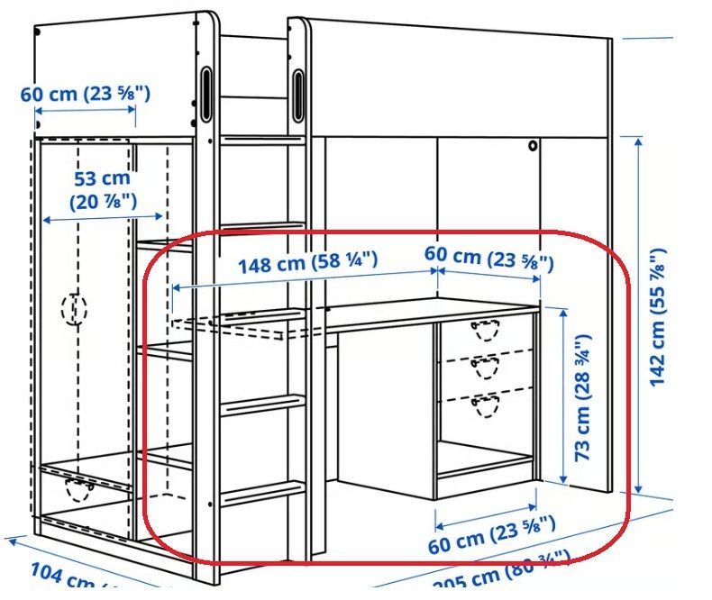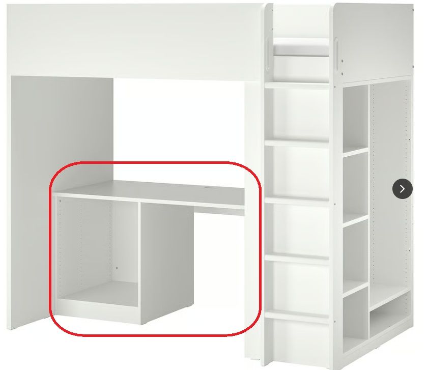 Stůl měl být součástí zvýšené dětské postele, ale nevyužijeme ho. Chybí mu tedy jedna boční stěna a šuplíky. Šuplíky by šlo dokoupit a boční stěnu jistě někdo šikovný dokáže vyrobit, případně by šly přimontovat obyčejné nohy ke stolu. Anebo prostě někdo využije ty desky.