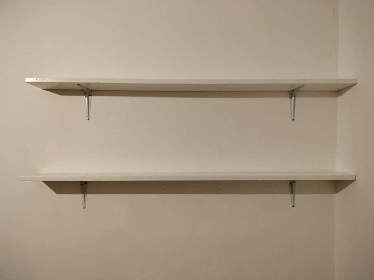 6 bílých polic, vyrobených z rámu postele IKEA.