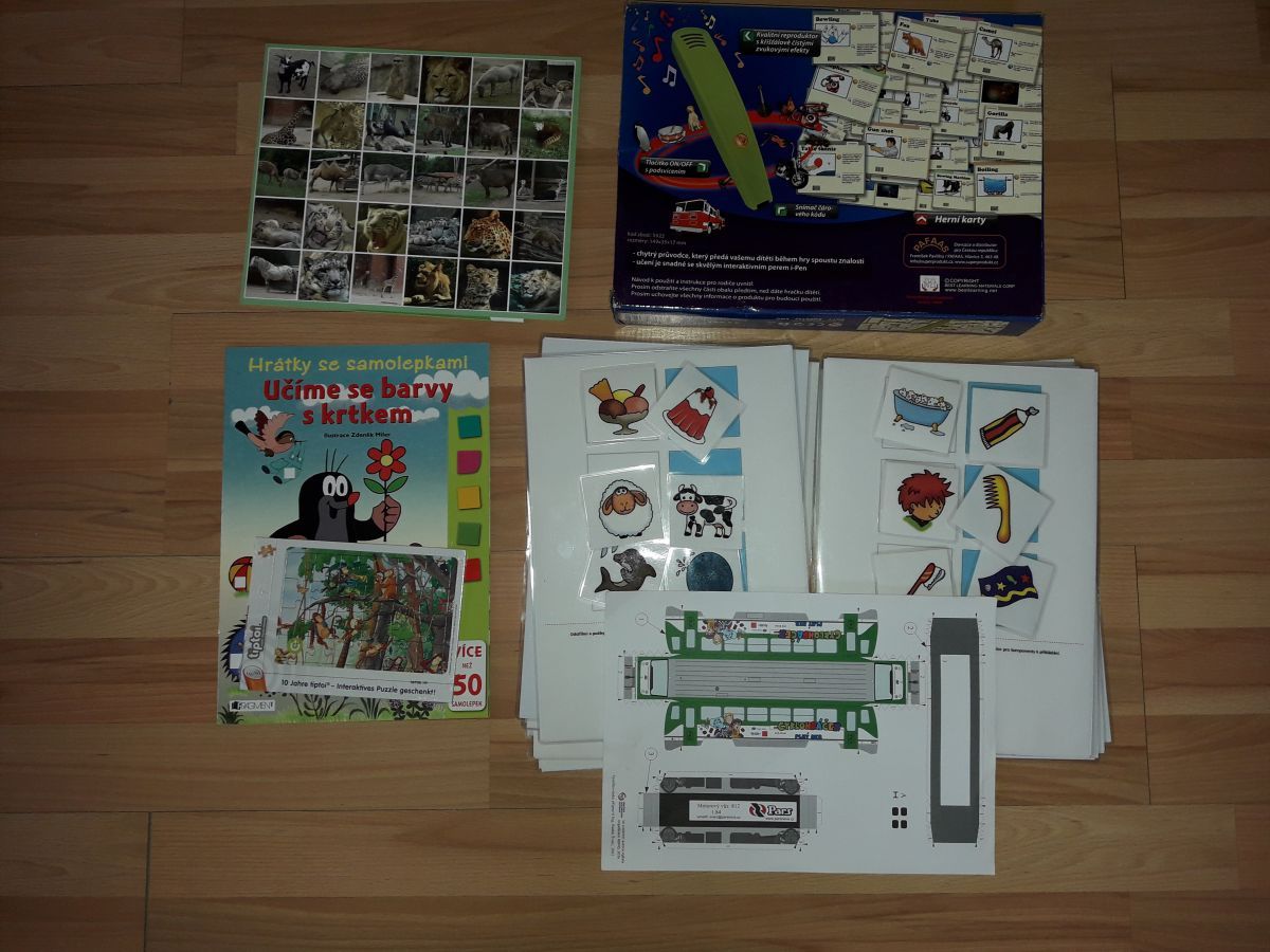 obrázky zvířátek, plastové stavebnicové kostky, provlékačky, krasohled, pexesa a další drobné hračky, viz. 4x foto.