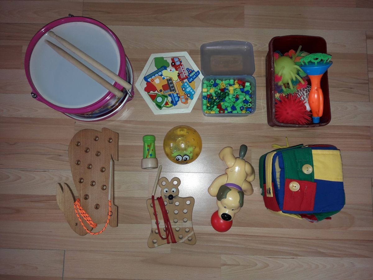 Jednoduché hračky, puzzle, obrázky, knížky, provlékačky, ...